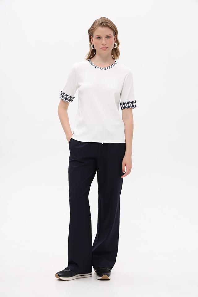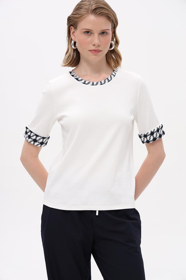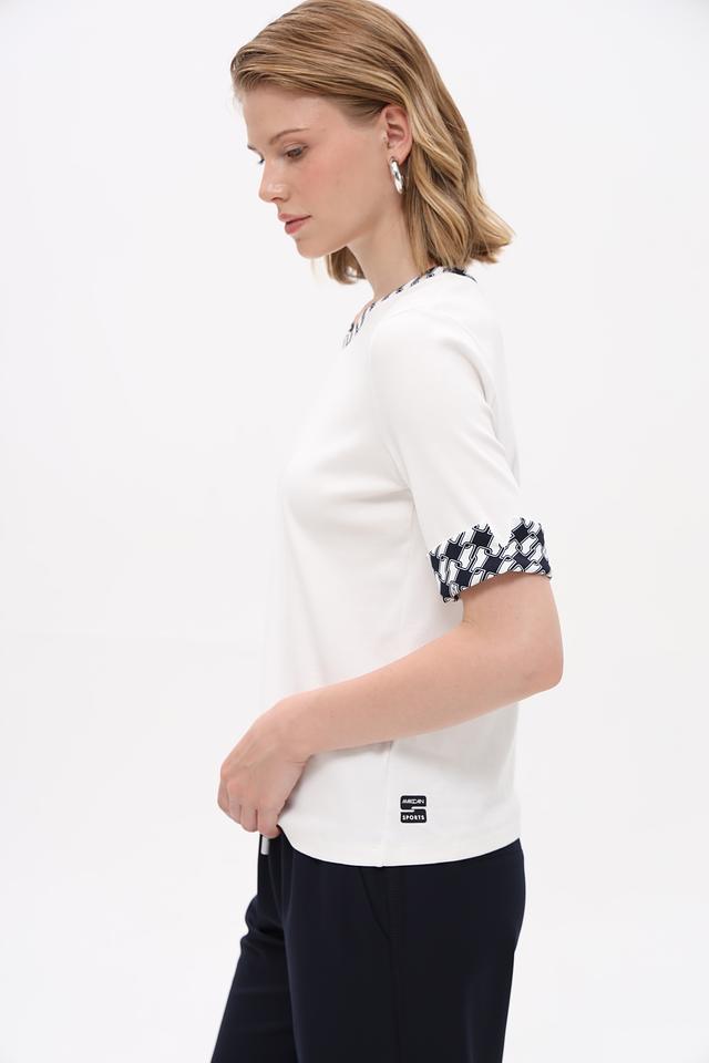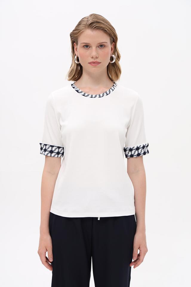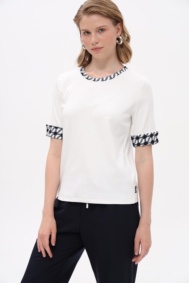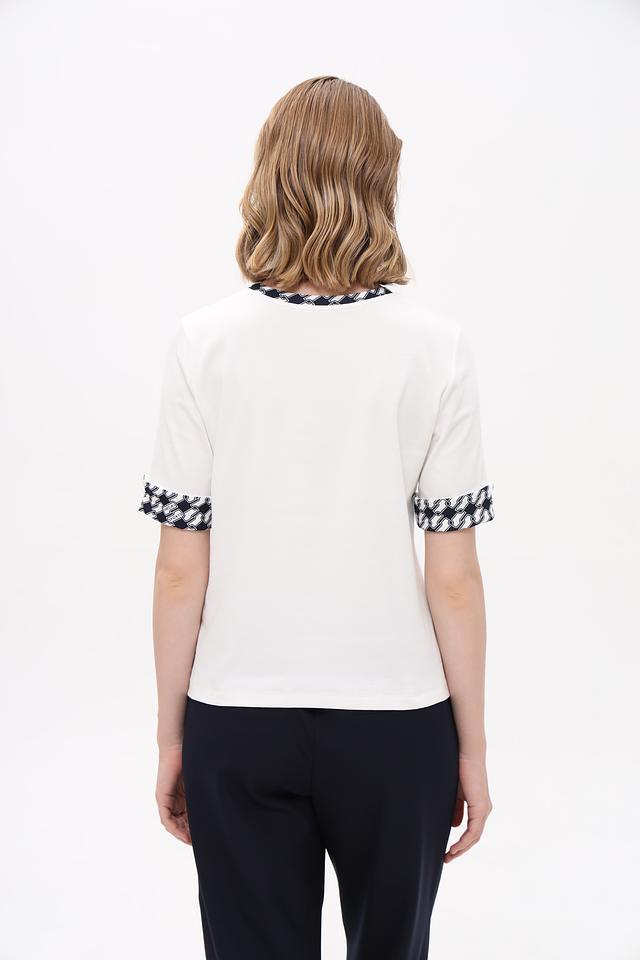 Основной цвет футболки – белый, что делает её универсальной для создания различных образов. Особенностью модели является оригинальный принт в клетку на рукавах и декоративная цепочка у горловины, которые придают ей изысканность и индивидуальность.