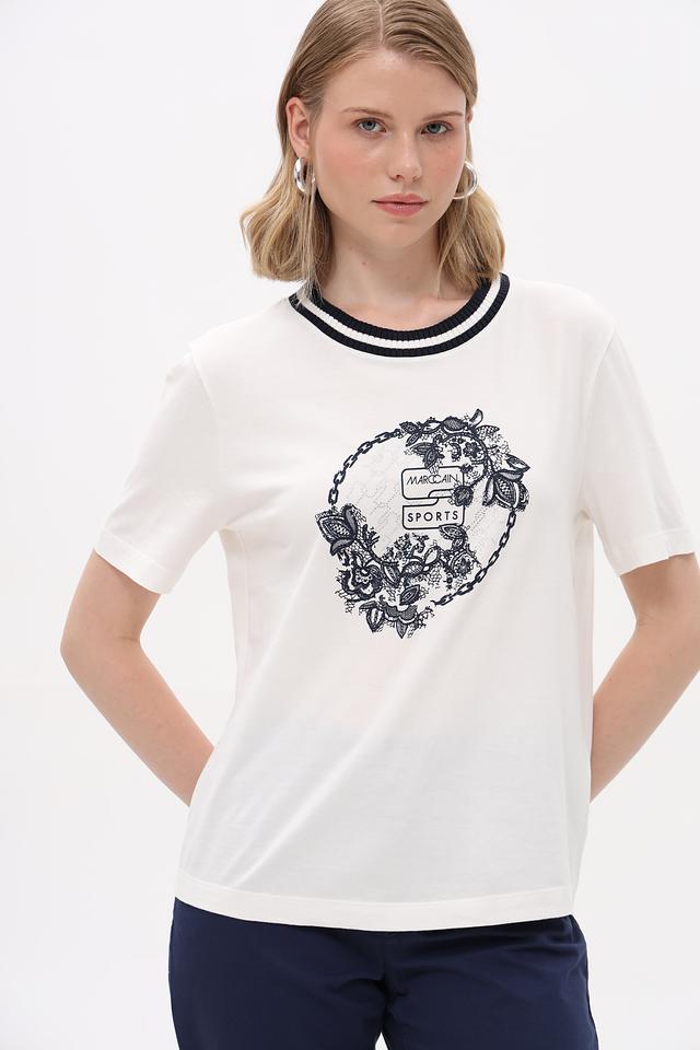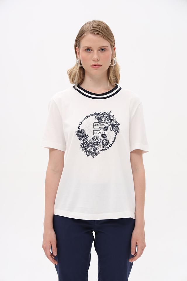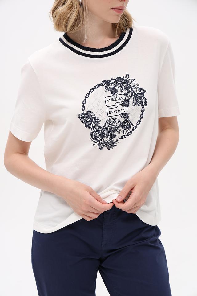 Футболка имеет прямой крой, короткие рукава и классическую круглую горловину, отделанную контрастной синей полосой. Центральным элементом дизайна является графичный принт в синих тонах, выполненный в виде цветочного орнамента и надписи 'Marc Cain Sports'.