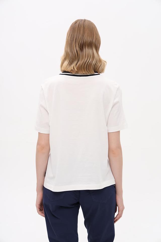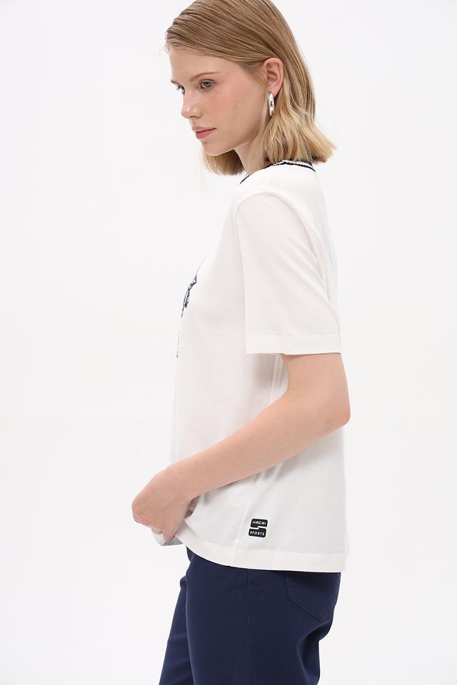 Белая футболка Marc Cain Sports с графичным принтом и отделкой горловины. Изготовлена из мягкого хлопка, обеспечивающего комфорт в течение дня. Идеальный выбор для создания спортивного и стильного образа. Состав: хлопок 100%