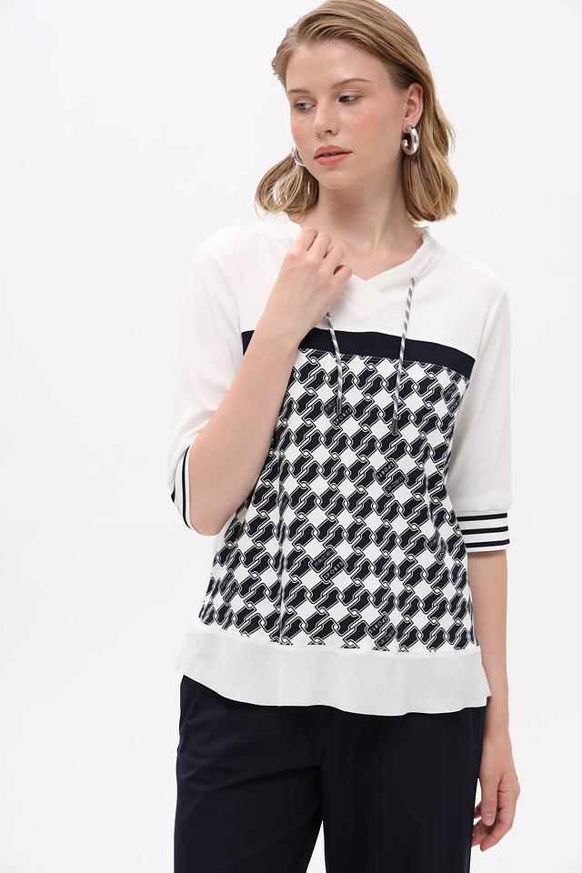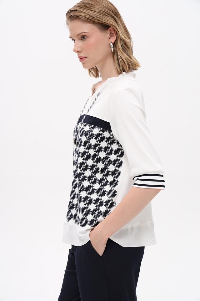 Эта стильная блузка от Marc Cain Sports станет прекрасным дополнением к вашему гардеробу. Она выполнена в белом цвете и украшена ярким геометрическим принтом в синих тонах, который придает ей особый шарм.