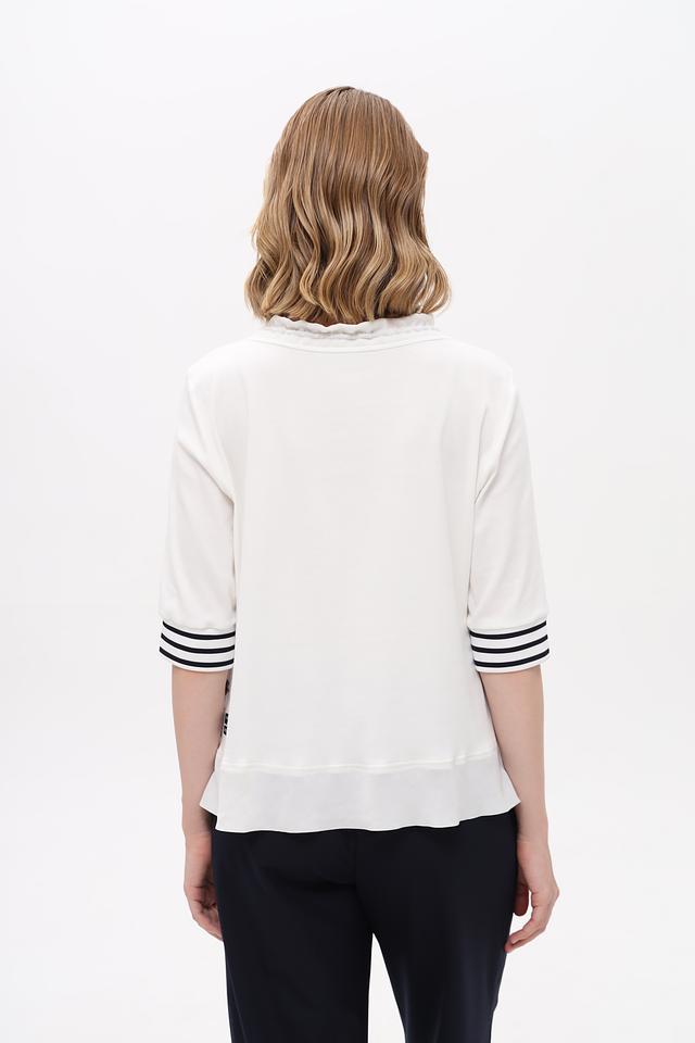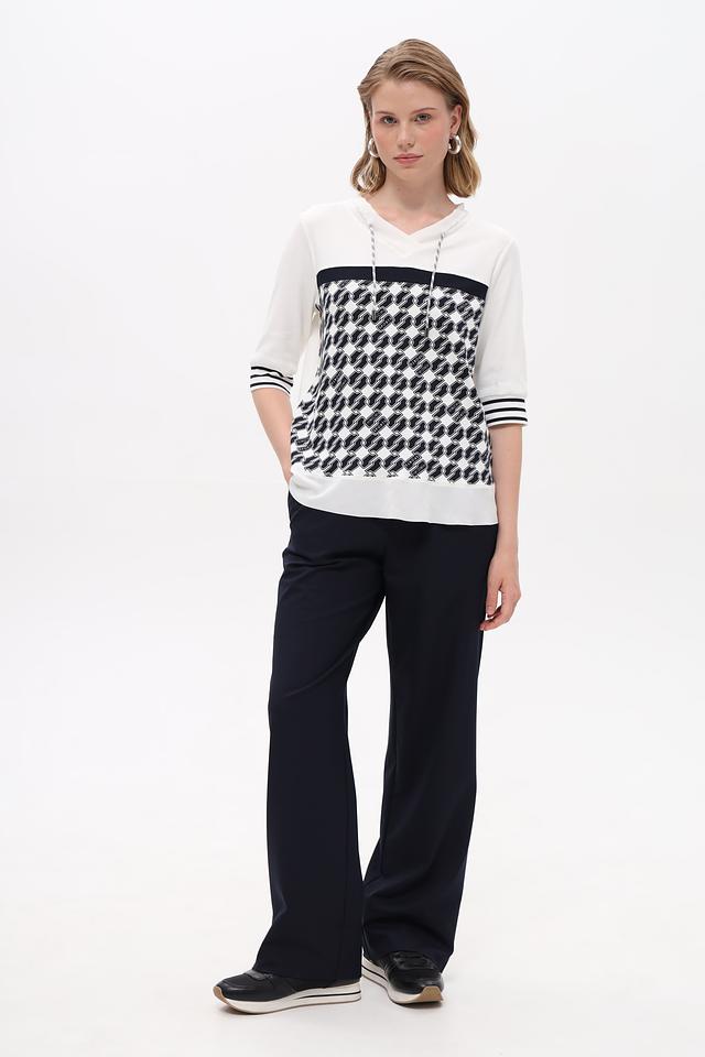 Блузка имеет V-образный вырез, короткие рукава с контрастными полосками и шнурок с кисточками, добавляющими образу непринужденности. Свободный крой обеспечивает комфорт при носке, а многослойный дизайн делает её более интересной и оригинальной.