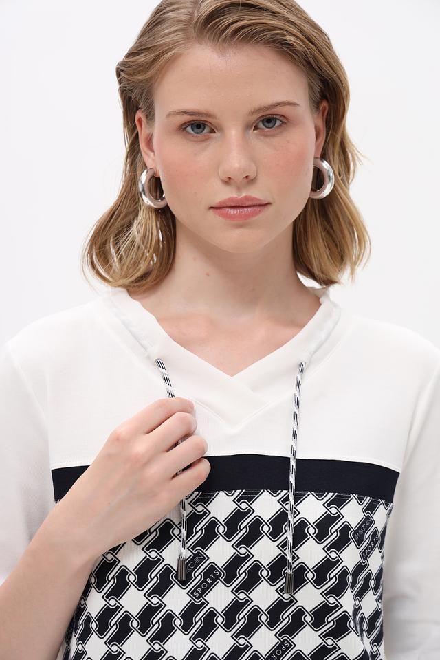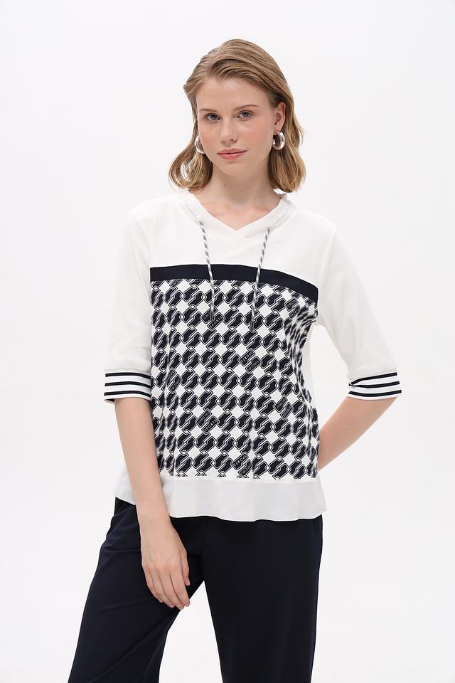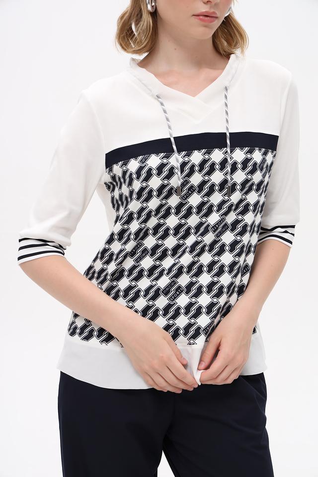 Белая блузка Marc Cain Sports с оригинальным геометрическим принтом. Выполнена из мягкого хлопка с добавлением эластана для комфорта и свободы движений. Отличный вариант для создания стильного повседневного образа. Состав: хлопок 94%, эластан 6%