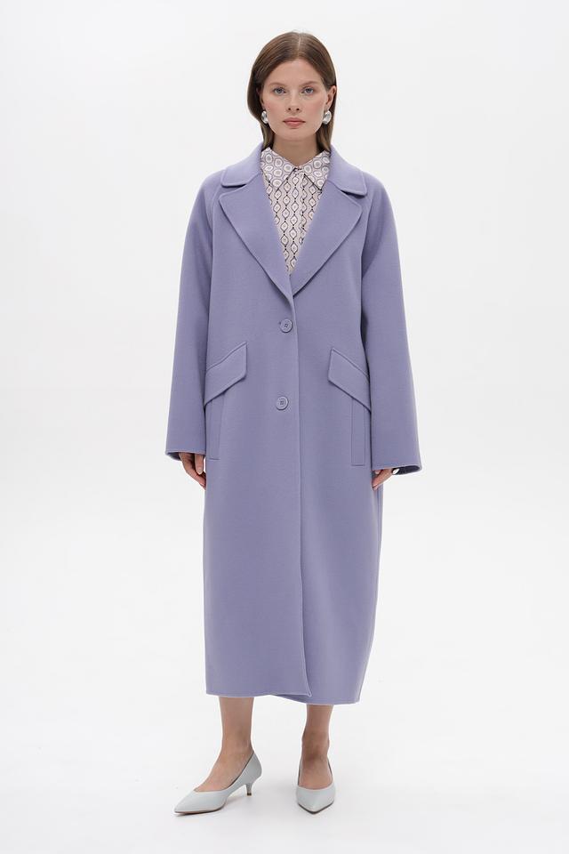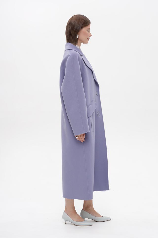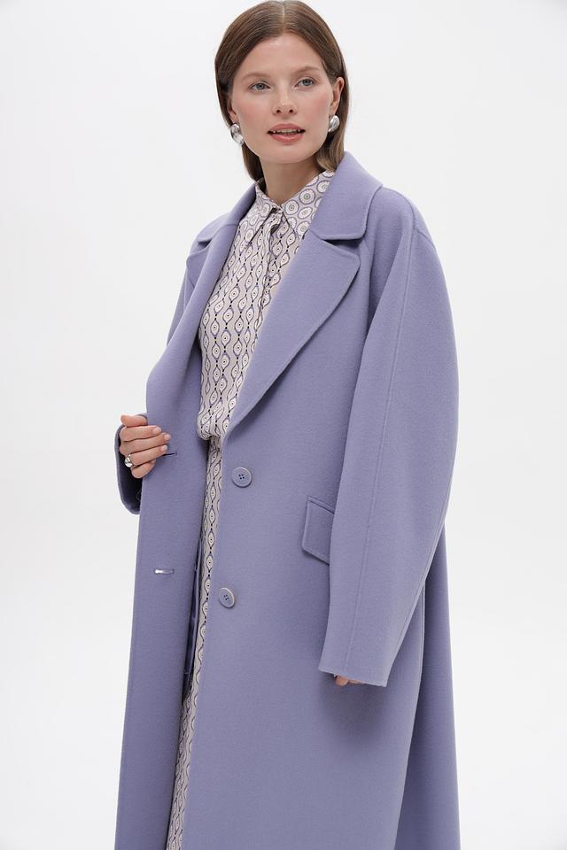 Классический двубортный крой с лацканами подчеркивает элегантность силуэта, а приталенный фасон выгодно выделяет фигуру. Пальто имеет длинную длину, до середины икры, что придает образу особую изысканность.