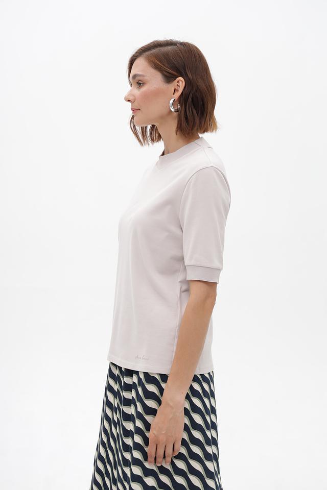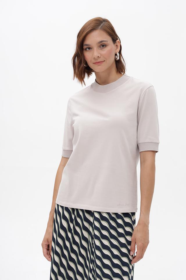 Футболка с короткими рукавами и округлым вырезом горловины. Вырез горловины декорирован тонкой тесьмой серебристого цвета, что придает модели изысканность.