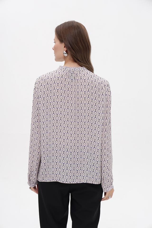 Изысканная блузка от Marc Cain Collections станет стильным дополнением вашего гардероба. Блузка выполнена в нежном бежевом цвете и украшена оригинальным геометрическим принтом, сочетающим в себе оттенки синего, серого и белого.