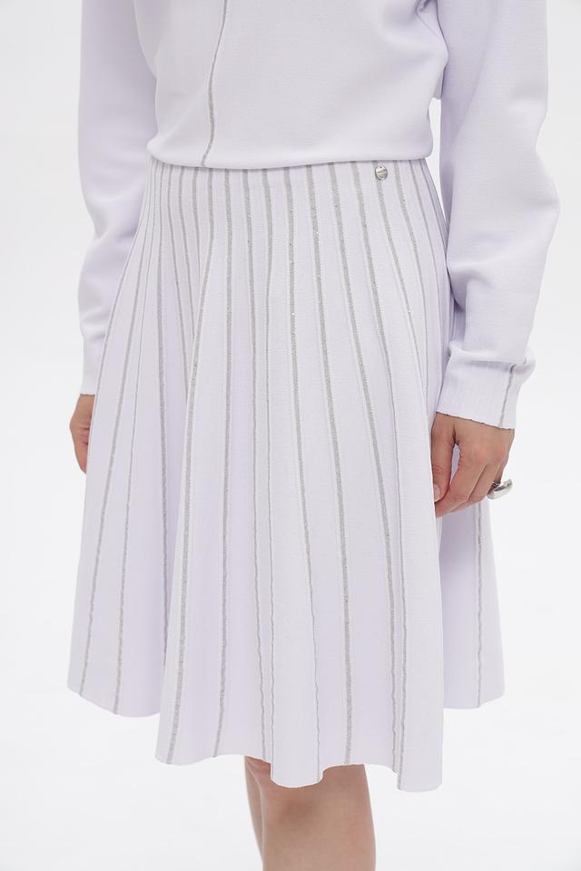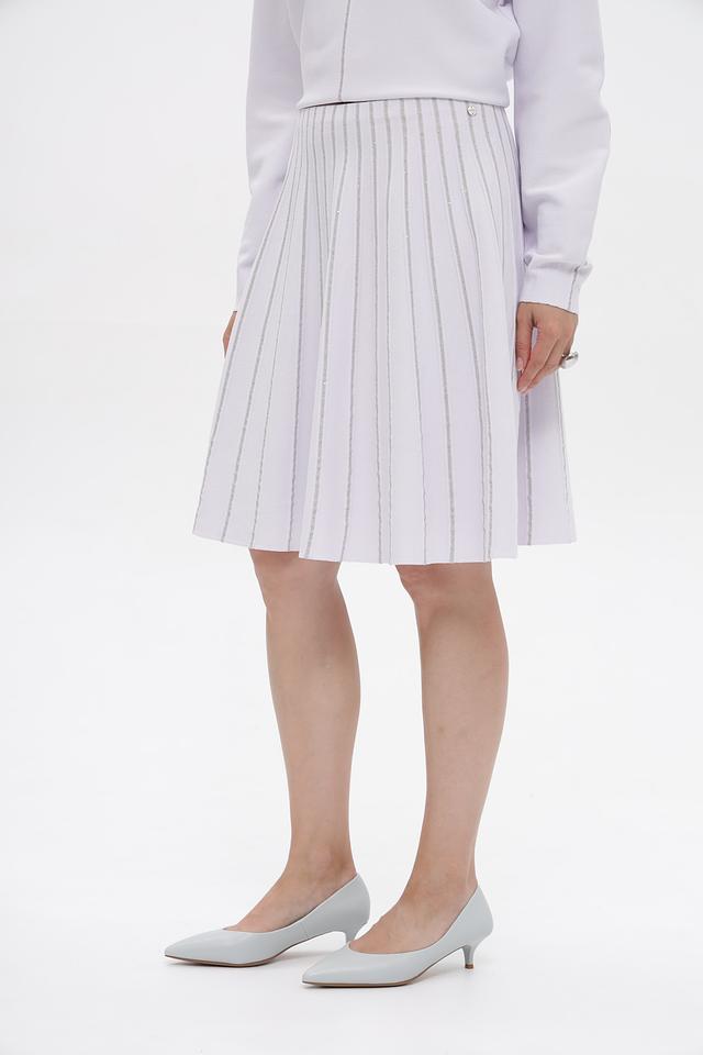 Юбка имеет классический крой с вертикальными складками, которые визуально удлиняют силуэт и придают образу лёгкость. Текстура ткани с деликатными полосками добавляет оригинальности и делает юбку более интересной.