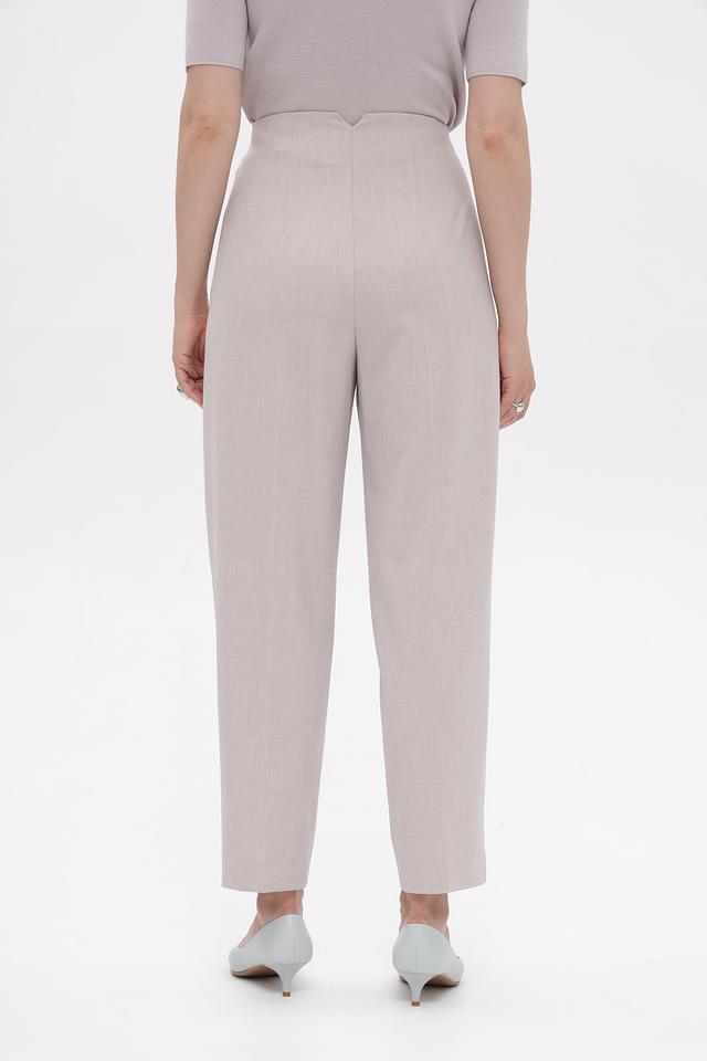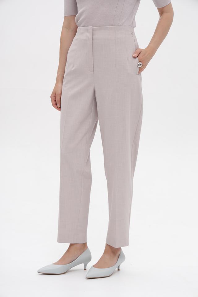 Брюки имеют высокую посадку, подчеркивающую талию и визуально удлиняющую ноги. Застежка-молния и пуговица обеспечивают надежную фиксацию. Модель дополнена боковыми карманами для удобства.
