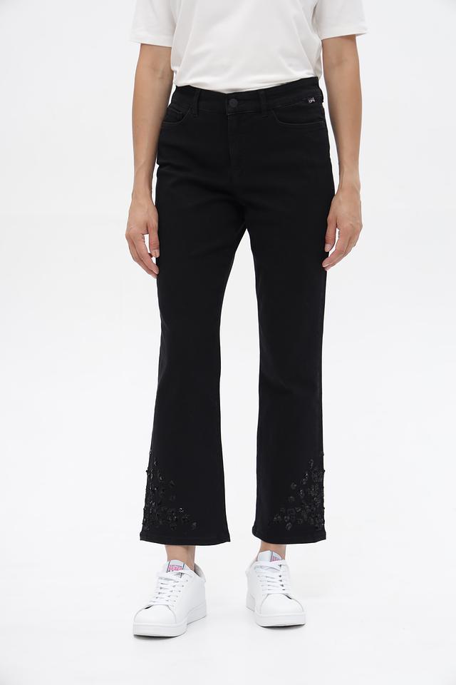 Представляем стильные джинсы от бренда Marc Cain, выполненные в классическом чёрном цвете. Модель отличается оригинальным дизайном благодаря декору из серебристых пайеток, расположенных на нижней части брюк.