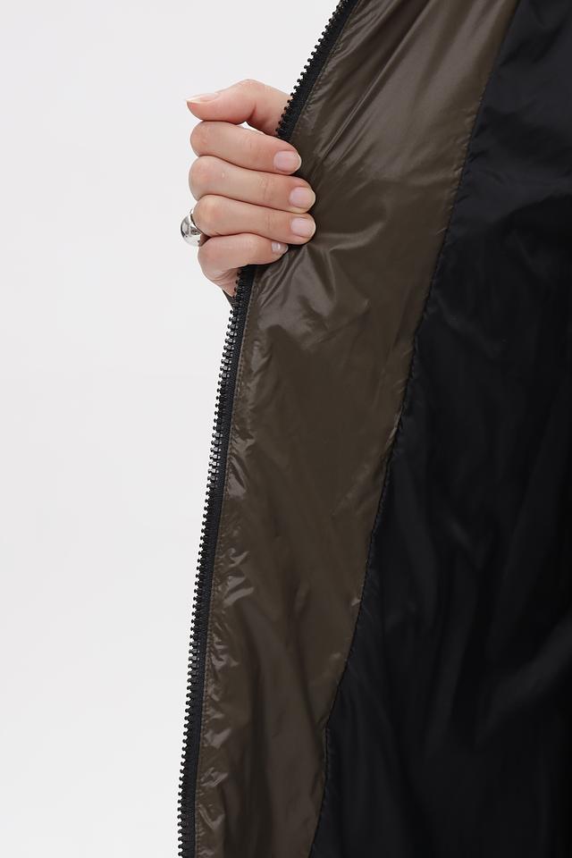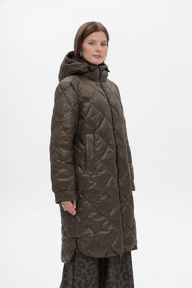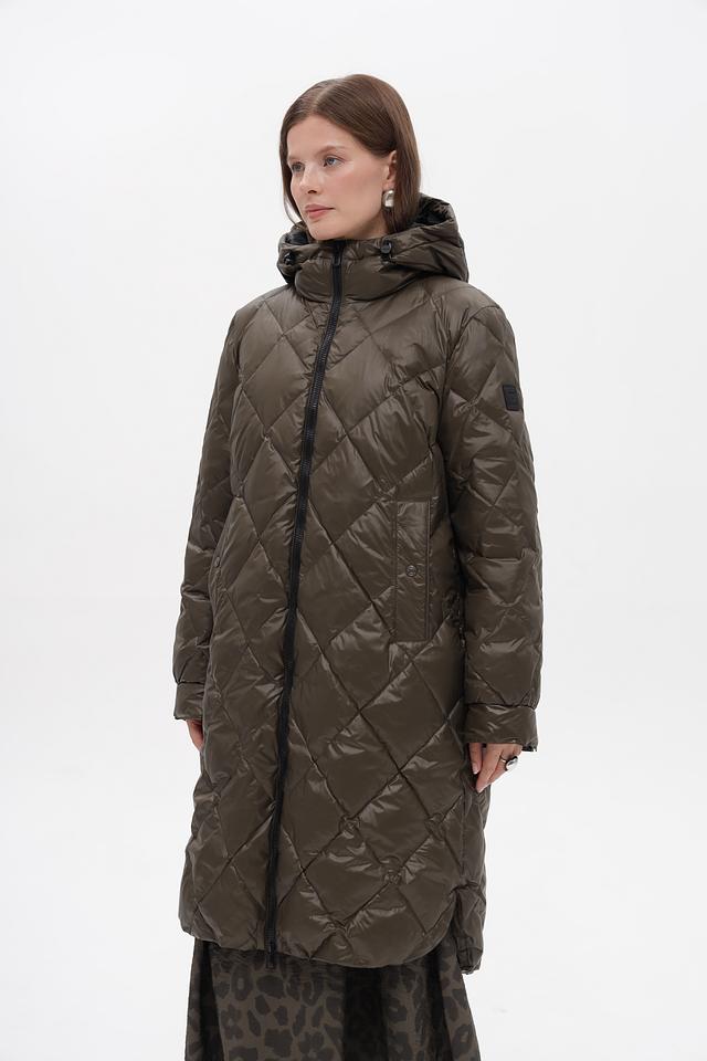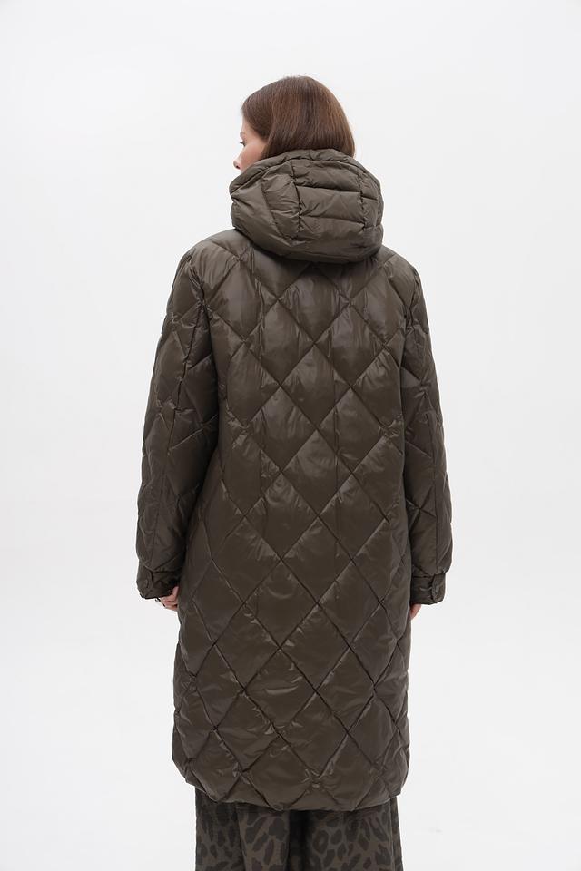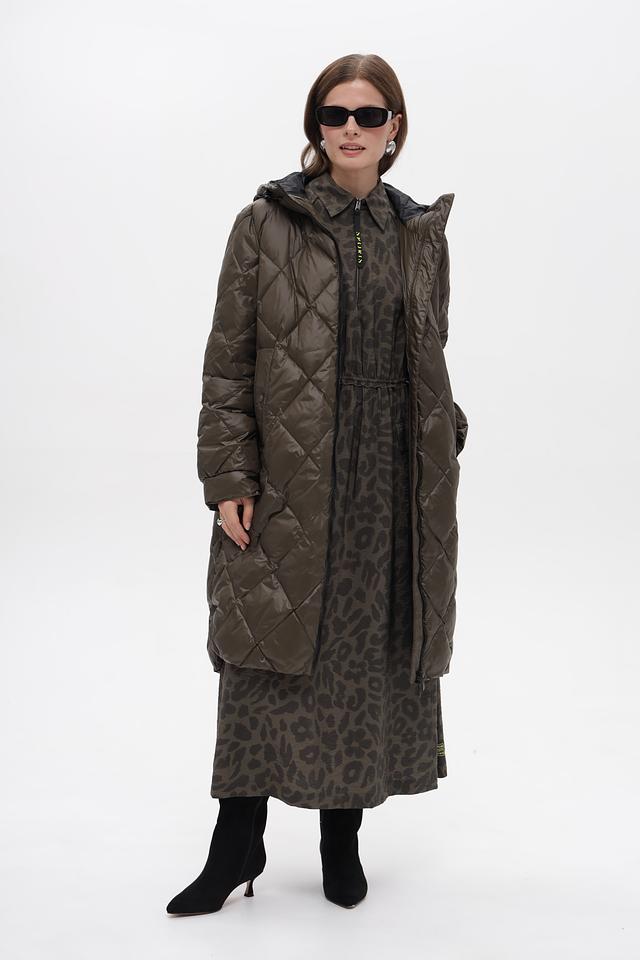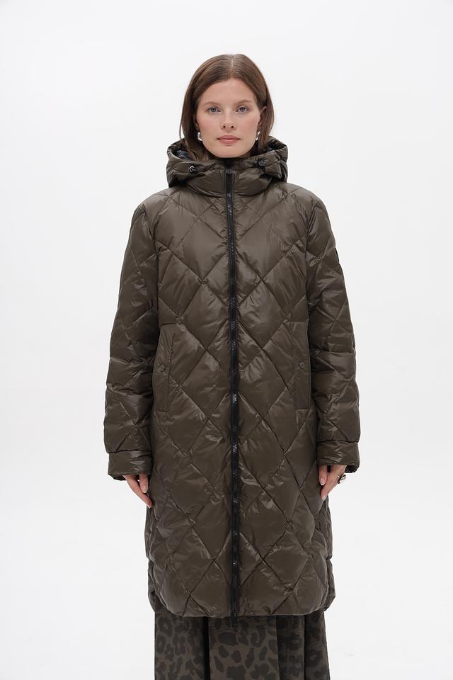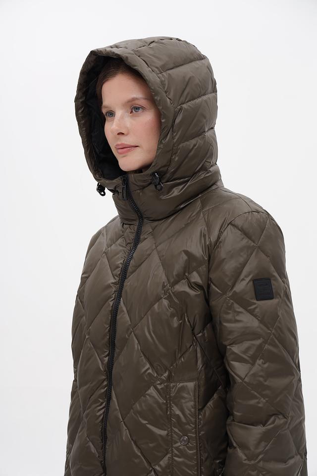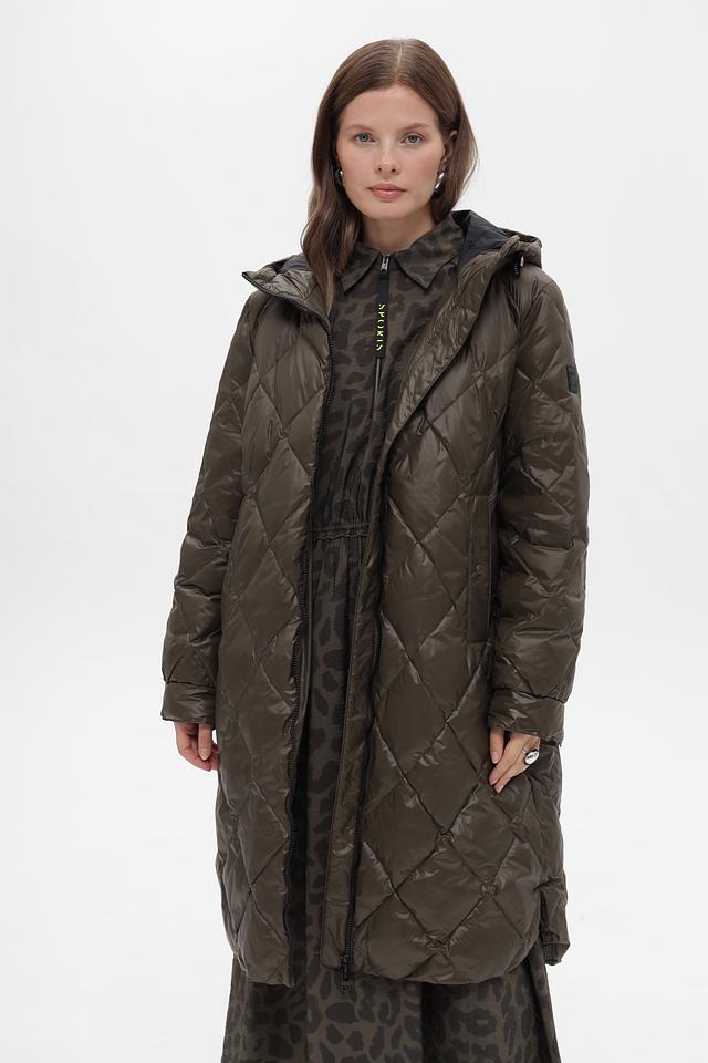 Модель имеет прямой крой, длину до середины икры и удобный капюшон. Застежка-молния позволяет легко регулировать степень теплоизоляции. Пальто выполнено в практичном цвете хаки, который легко сочетается с различными элементами гардероба.