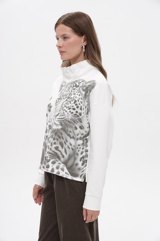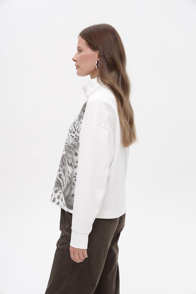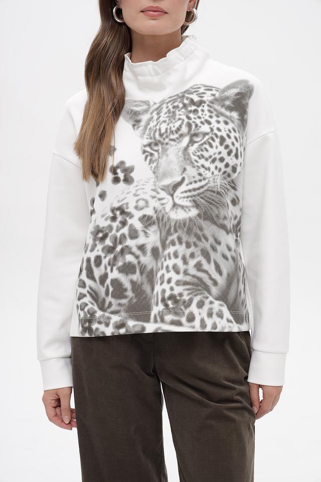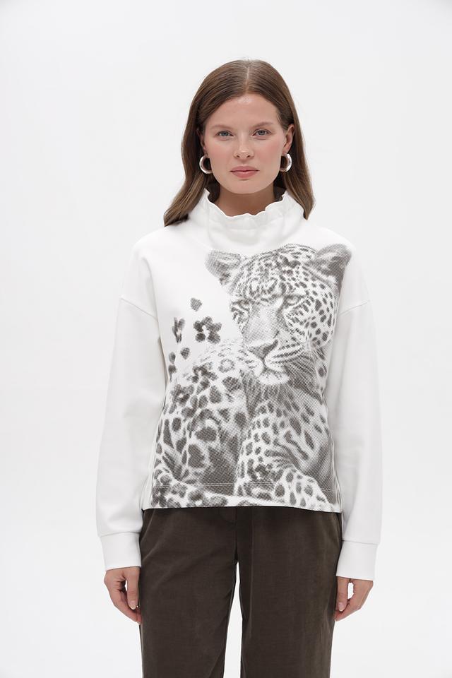 Этот стильный пуловер от Marc Cain станет ярким акцентом в вашем гардеробе. Модель выполнена в белом цвете и украшена крупным принтом леопарда, расположенным на передней части изделия.