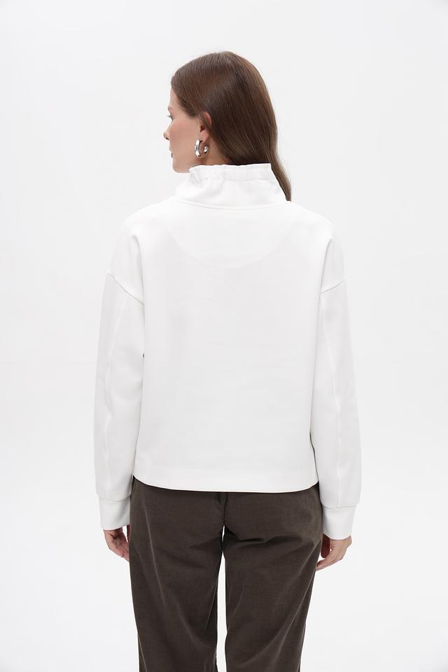 Пуловер имеет удобный воротник-стойку с небольшими присборками, который добавляет образу изысканности. Свободный крой обеспечивает комфортную посадку по фигуре, а длинные рукава делают его идеальным для прохладной погоды.