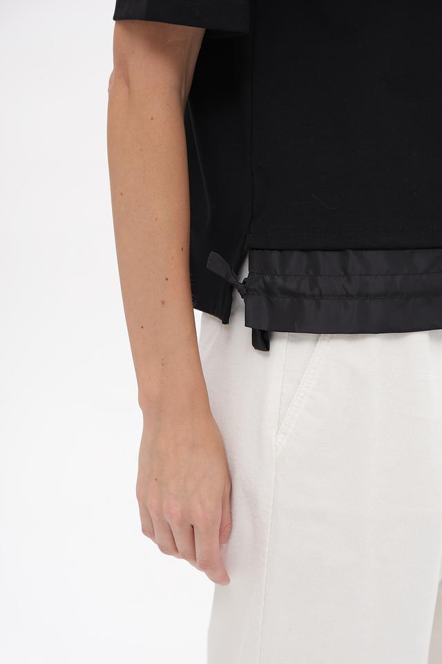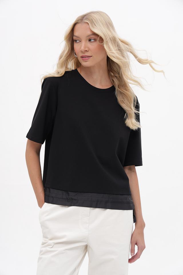Чёрный пуловер Marc Cain с короткими рукавами и контрастной отделкой. Изготовлен из мягкого хлопка с модалом и небольшим добавлением эластана для комфортной посадки. Состав: хлопок 47%, модал 47%, эластан 6%