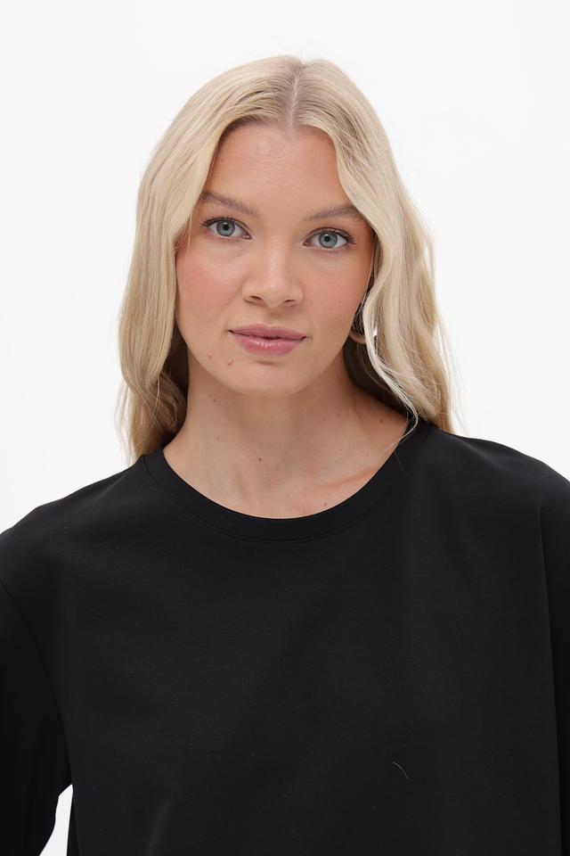 Пуловер имеет прямой, слегка свободный крой, который обеспечивает свободу движений. Короткие рукава и круглый вырез горловины делают его универсальным для различных образов. Особый акцент в дизайне — контрастная отделка по низу изделия, выполненная из гладкой ткани, добавляющая модели изысканность и динамичность.