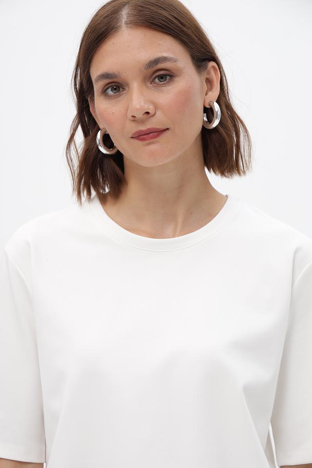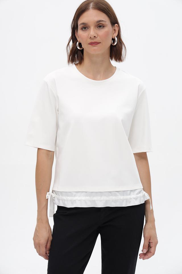 Модель имеет короткие рукава и свободный крой, обеспечивающий комфорт при ношении. Особый акцент сделан на декоративные оборки по нижнему краю, которые придают изделию женственность и изысканность.