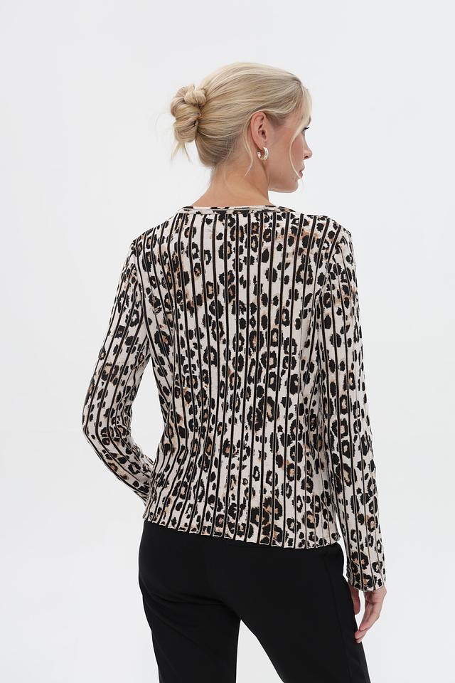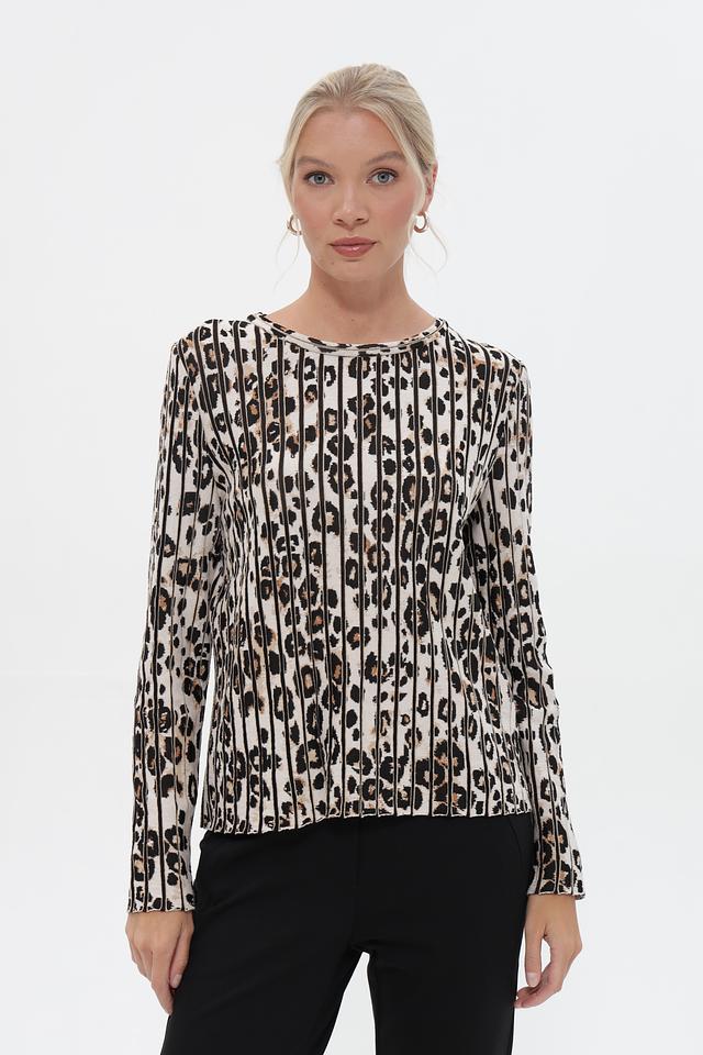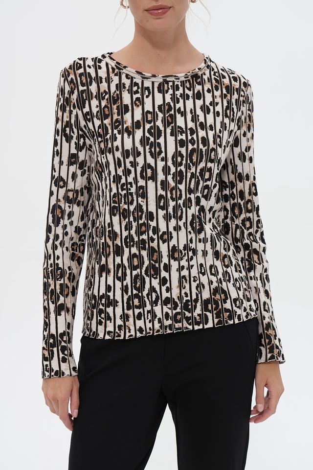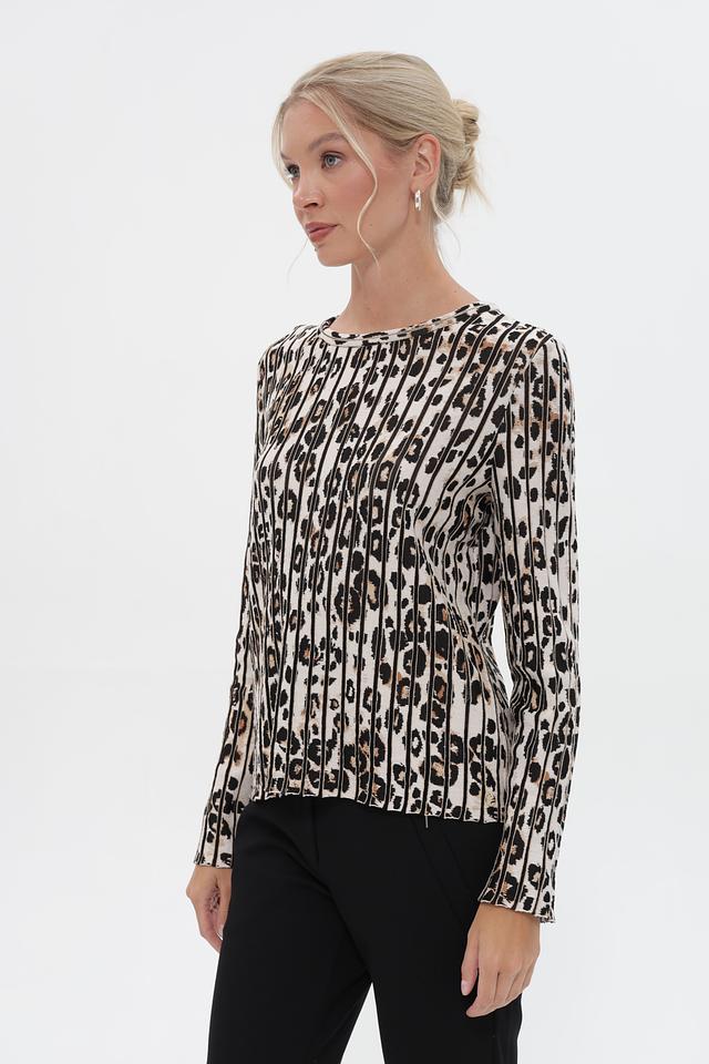 Женский пуловер Marc Cain бежевого цвета с оригинальным леопардовым принтом. Изготовлен из мягкой вискозы с добавлением хлопка для комфорта и эластана для лучшей посадки. Идеальный выбор для создания стильного и элегантного образа. Состав: вискоза 59%, хлопок 36%, полиамид 4%, эластан 1%