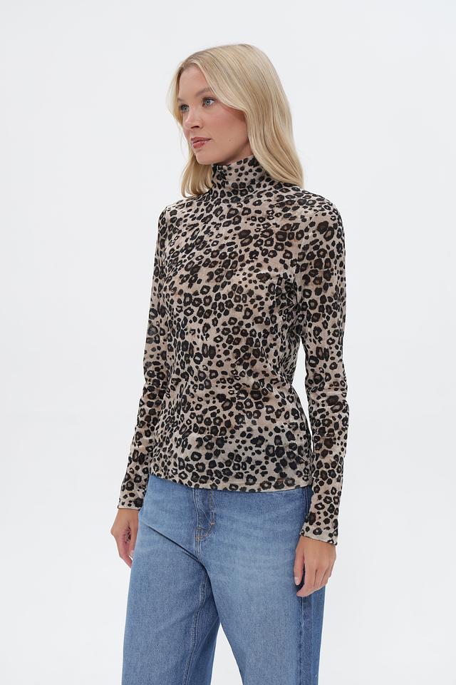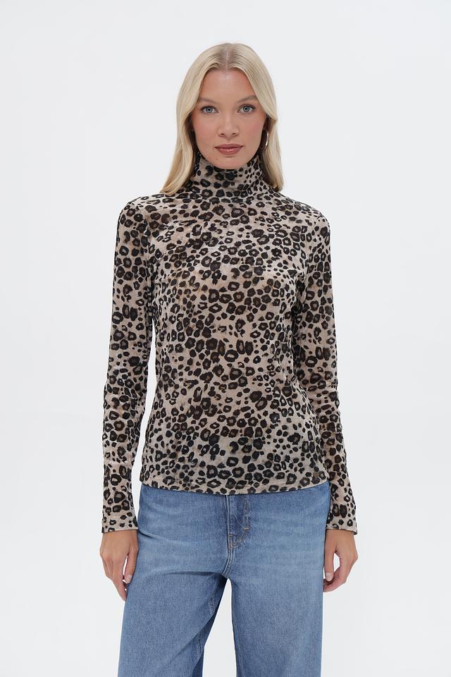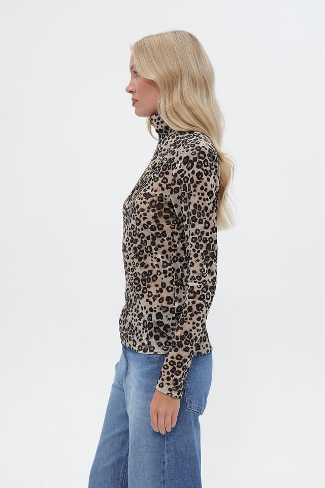 Футболка имеет облегающий силуэт, длинные рукава и высокий воротник-водолазку. Главная особенность модели – эффектный леопардовый принт, который добавляет образу динамичности и выразительности.