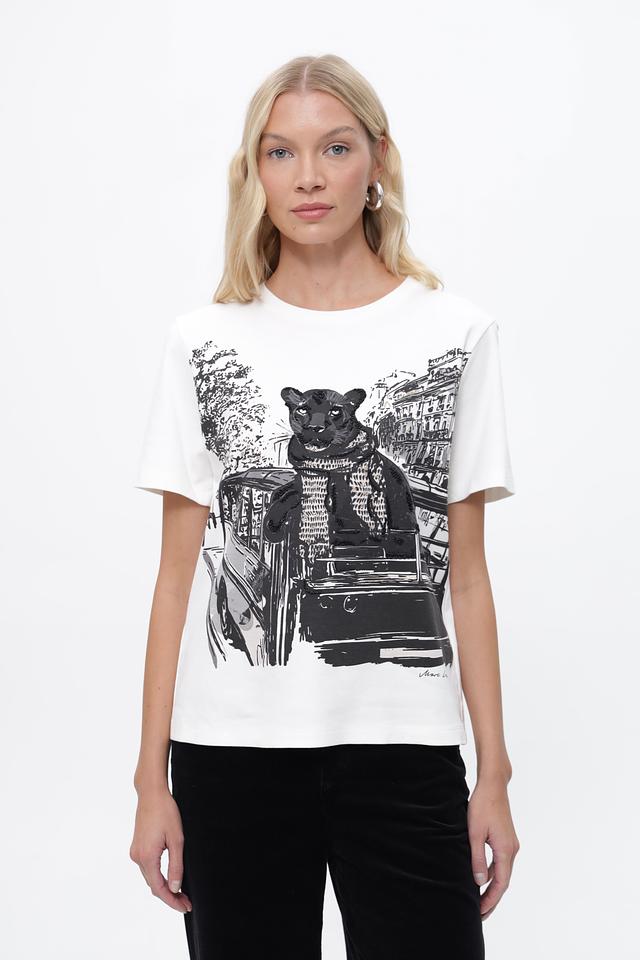 Особенность этой модели - оригинальный принт с изображением медведя, выполненный в графичном стиле на фоне городского пейзажа. Такой рисунок добавит образу индивидуальности и неповторимости. Футболка идеально подойдет для создания стильных повседневных образов.