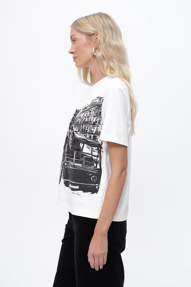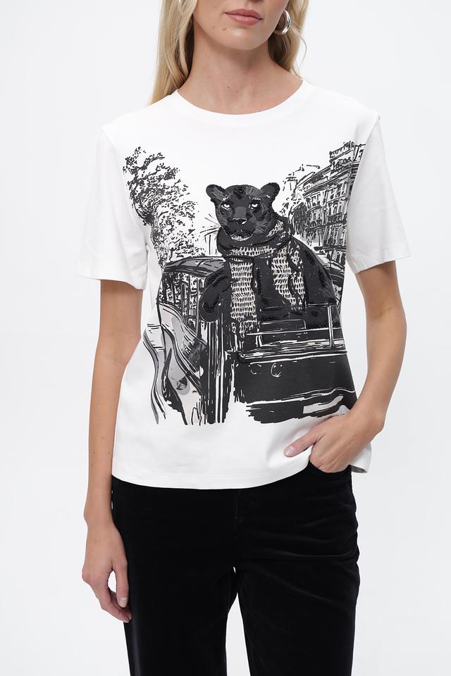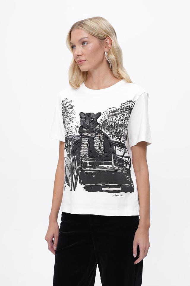 Белая футболка Marc Cain с оригинальным графичным принтом медведя на фоне городского пейзажа. Изготовлена из 100% хлопка, обеспечивающего комфорт и воздухопроницаемость. Стильный и удобный выбор для повседневного образа. Состав: хлопок 100%