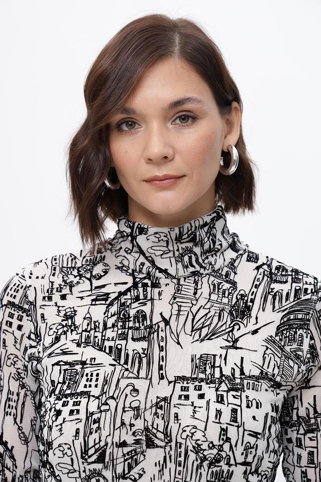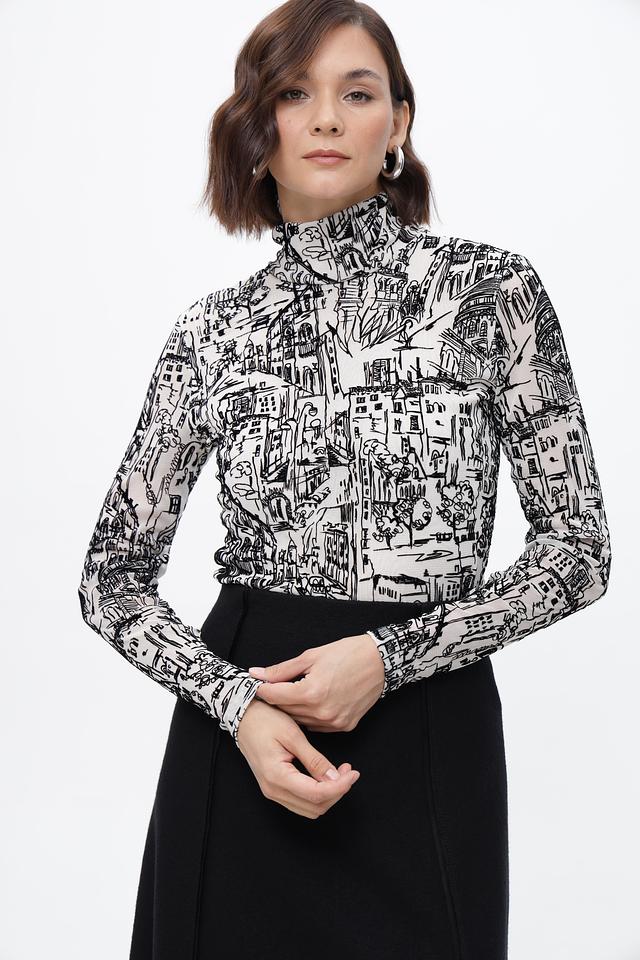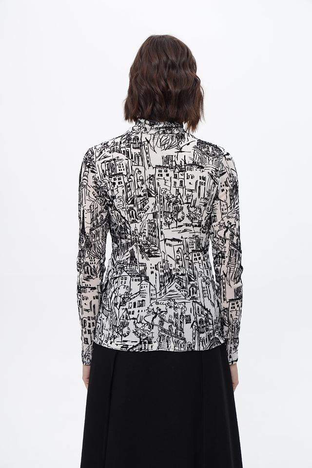 Модель выполнена в белом цвете и украшена эффектным принтом с изображением городской архитектуры. Принт придает изделию оригинальность и индивидуальность.