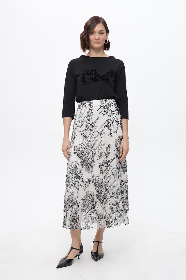 Модель имеет приталенный силуэт, подчёркивающий фигуру, и рукав три четверти. Особый акцент – стильный принт с изображением городского пейзажа, добавляющий образу индивидуальность.