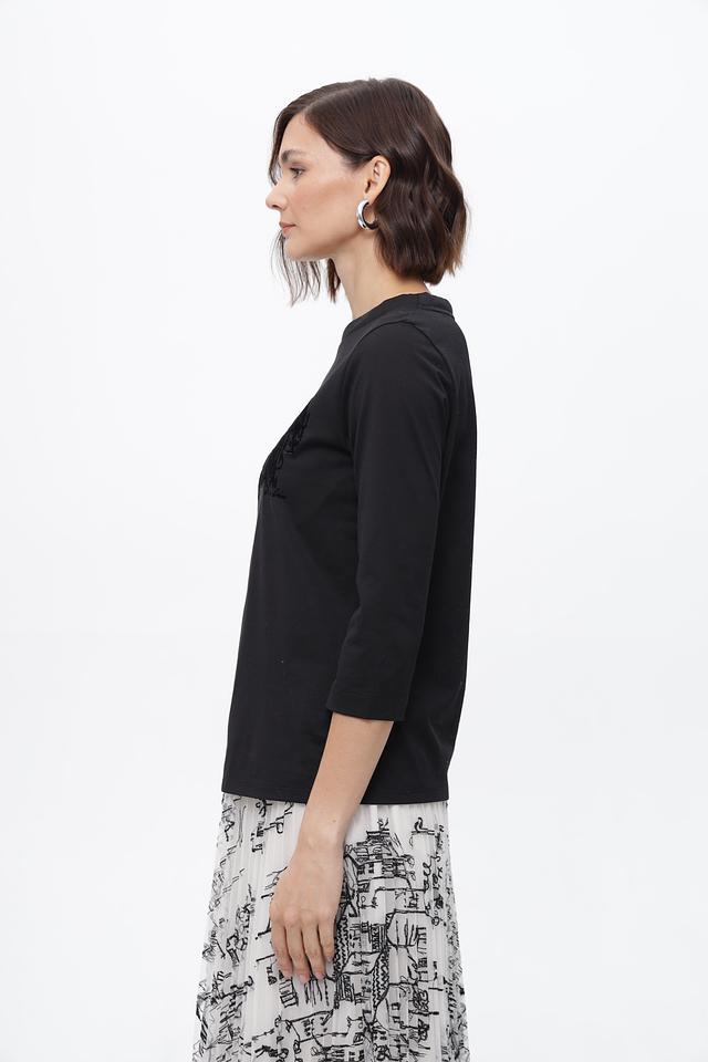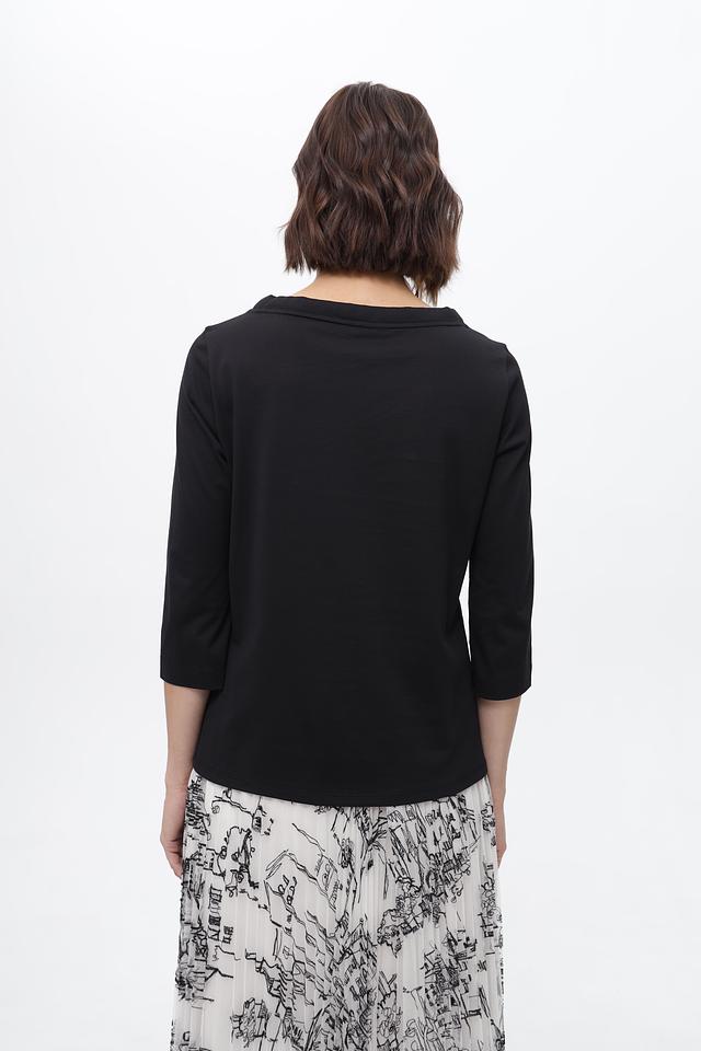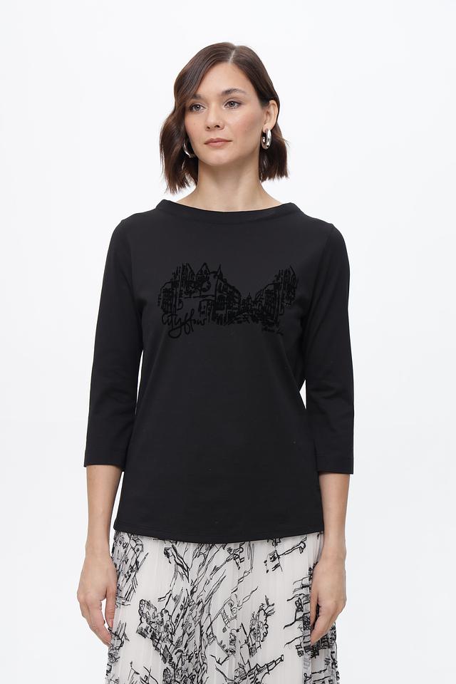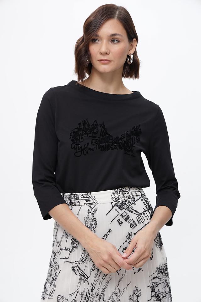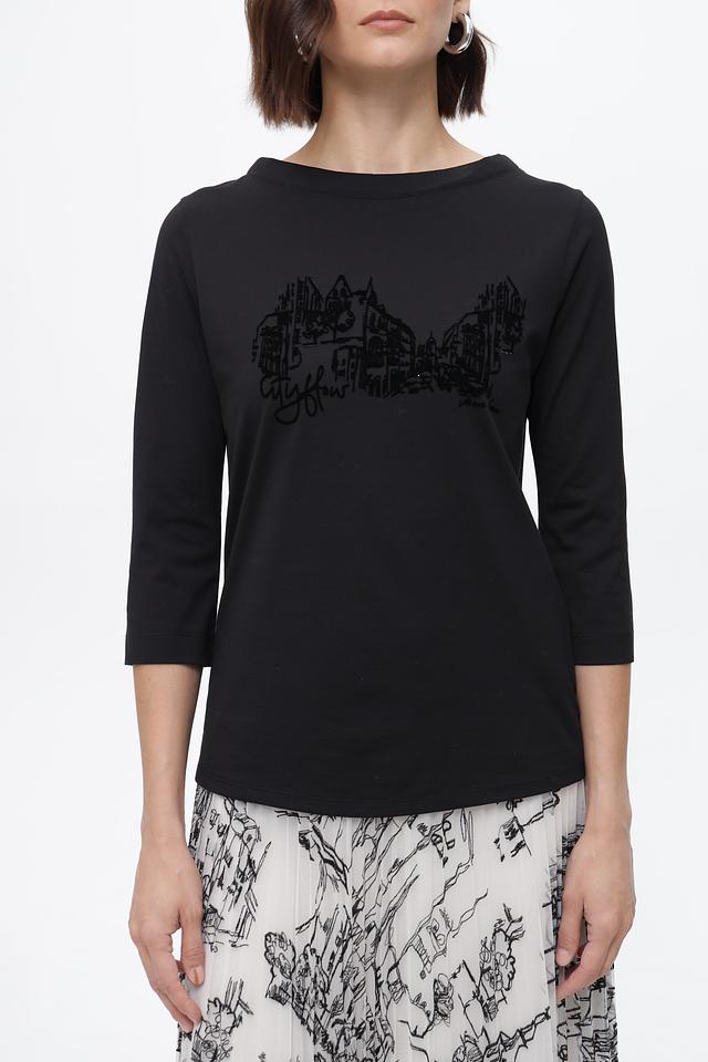 Чёрная футболка Marc Cain из органического хлопка с оригинальным принтом. Модель с рукавом 3/4 и круглым вырезом. Идеальный выбор для создания стильного повседневного образа. Состав: хлопок органич. 100%
