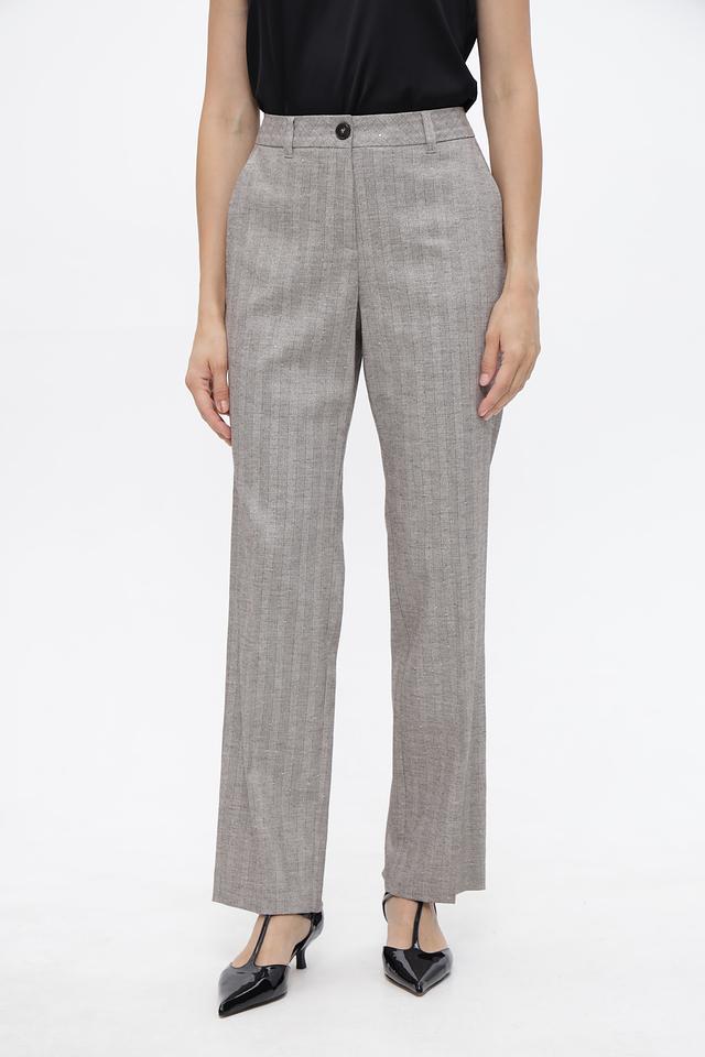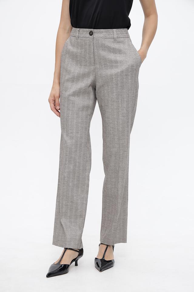 Брюки имеют высокую посадку, прямой крой и стандартную длину. Спереди расположены боковые карманы, а сзади — два кармана с клапанами.