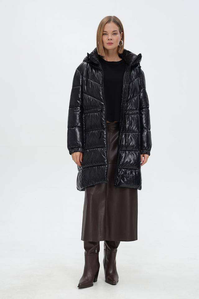 Пальто имеет прямой, приталенный силуэт, который подчеркивает фигуру. Капюшон добавляет функциональности и защищает от непогоды.