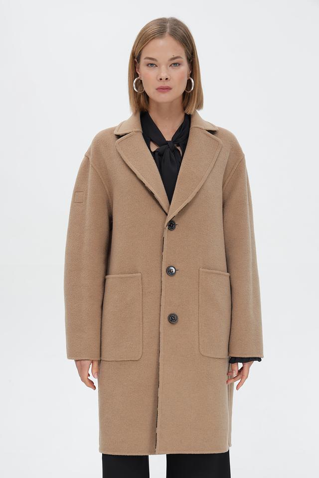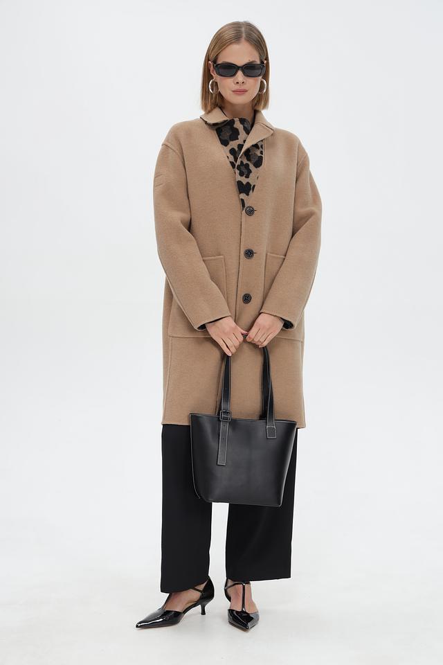Пальто имеет классический двубортный крой с отложным воротником. Боковые карманы обеспечивают удобство, а длинные рукава защищают от холода.