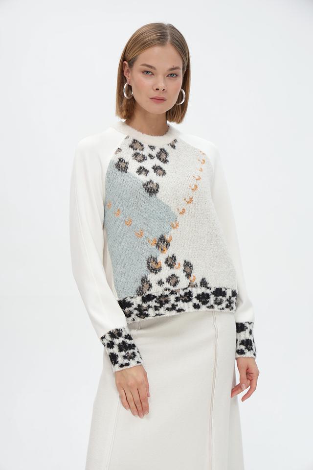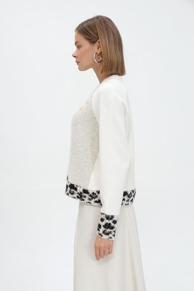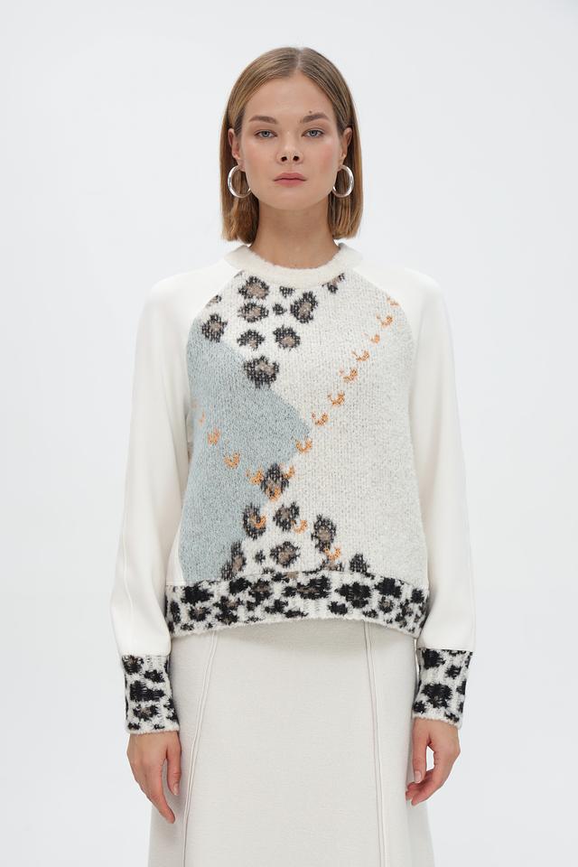 Представляем стильный пуловер от бренда Marc Cain. Модель выполнена в белом цвете и отличается необычным дизайном – сочетанием однотонных рукавов и центральной части с ярким леопардовым принтом.