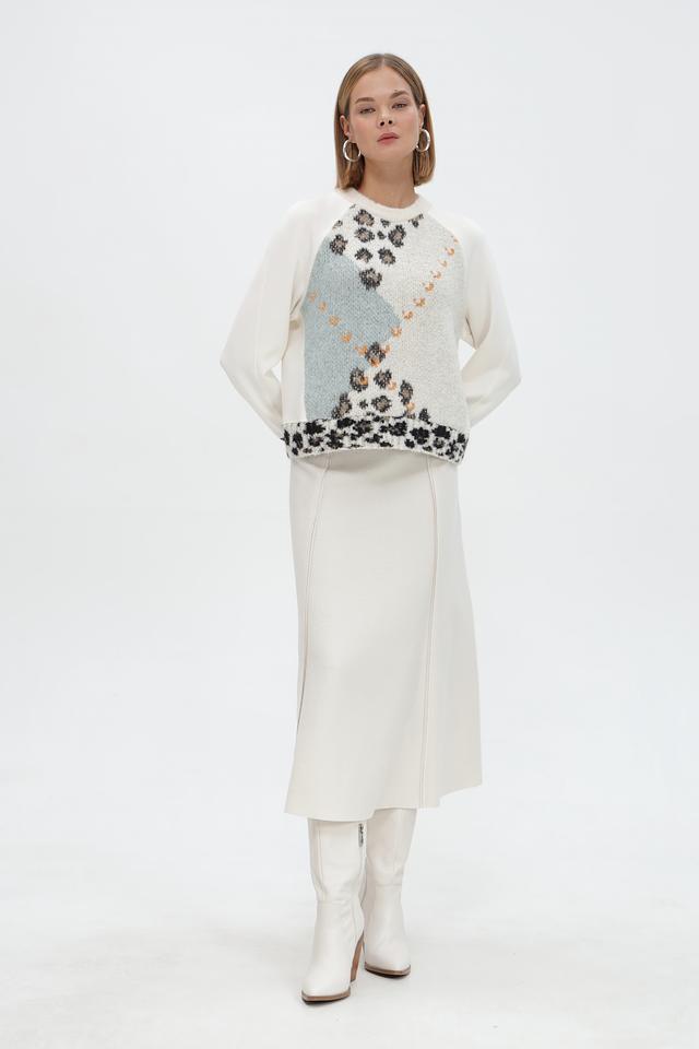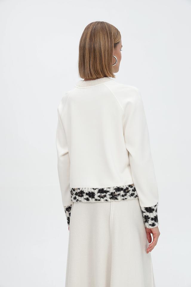 Белый пуловер Marc Cain с оригинальным дизайном: сочетание однотонных рукавов и фактурной вставки с леопардовым принтом. Модель выполнена из мягкой вискозы, полиамида и эластана. Состав: полиамид 47%, вискоза 44%, эластан 9%