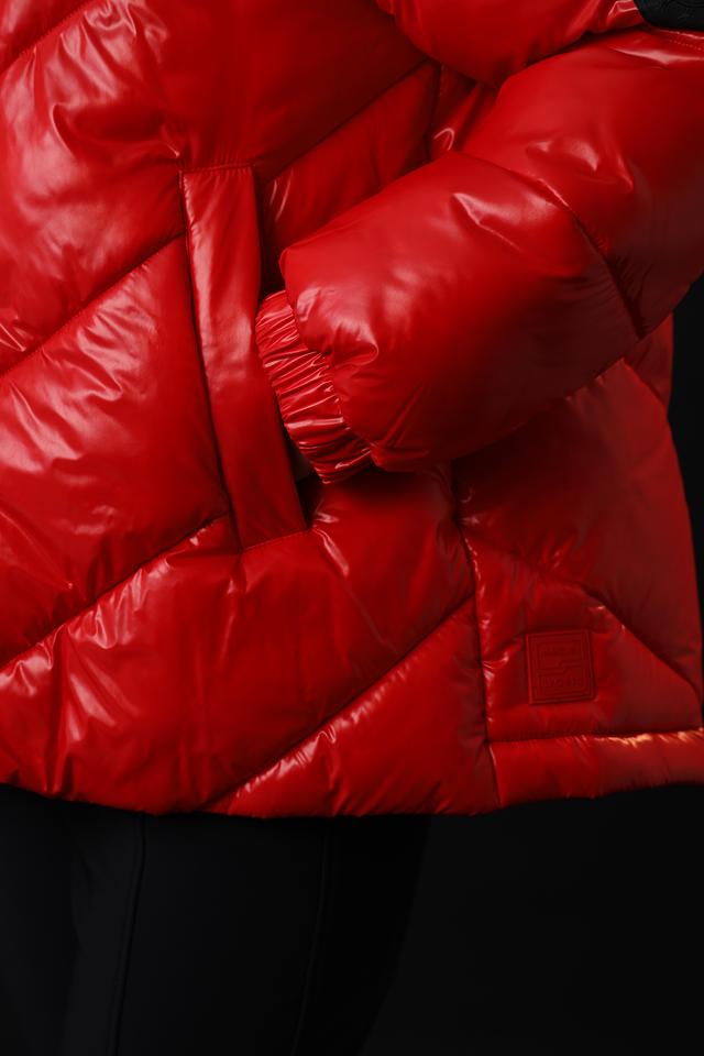 Эластичные манжеты и резинка по низу куртки обеспечивают плотное прилегание, сохраняя тепло. Куртка оснащена боковыми карманами на молнии для хранения необходимых мелочей. Глянцевая текстура ткани придает изделию особый шарм и элегантность.