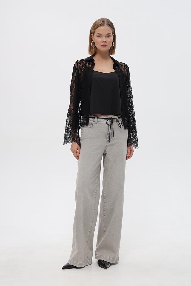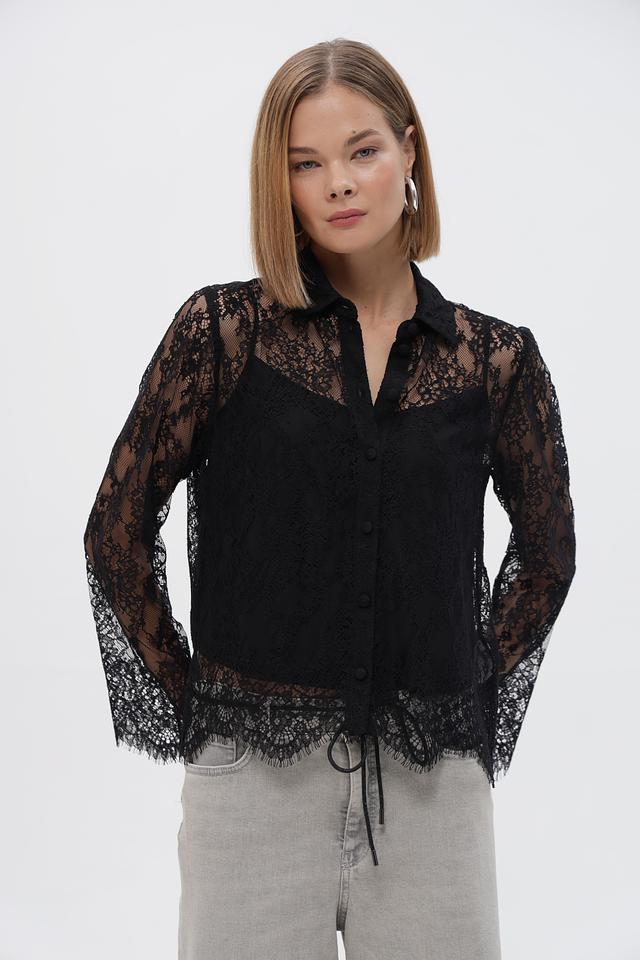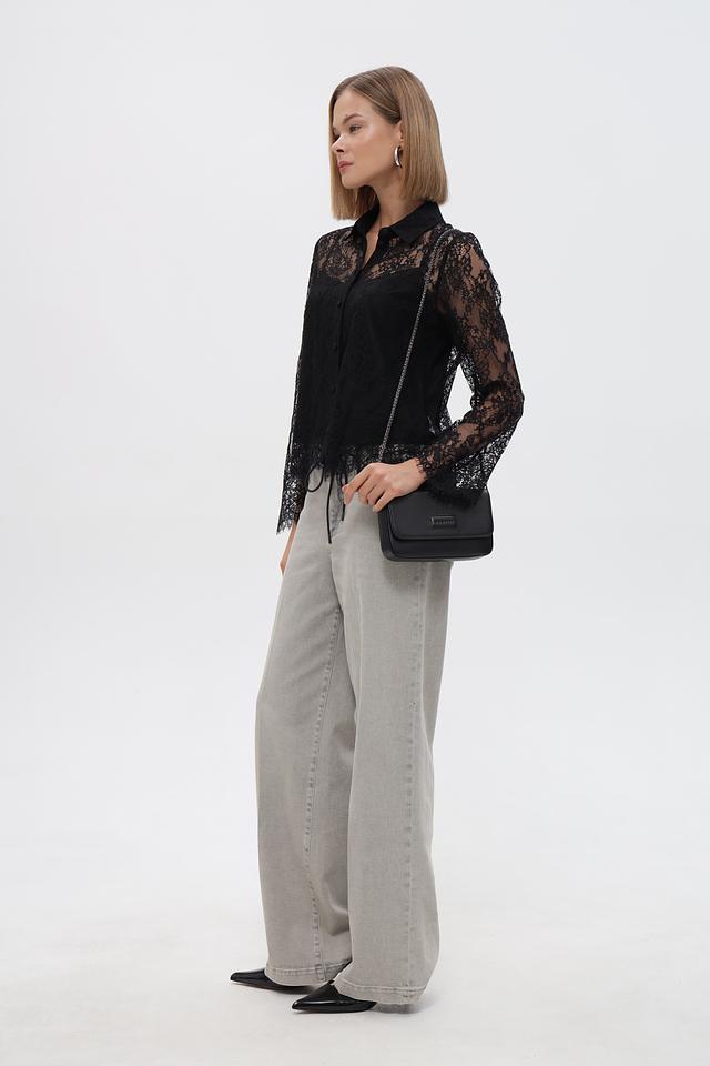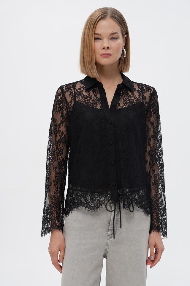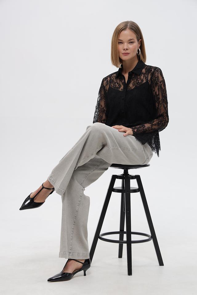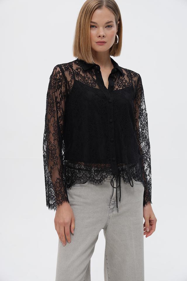 Блузка застегивается на ряд пуговиц по всей длине. Полупрозрачная текстура кружева придает образу легкость и женственность. Модель отлично сочетается с юбками, брюками и джинсами.