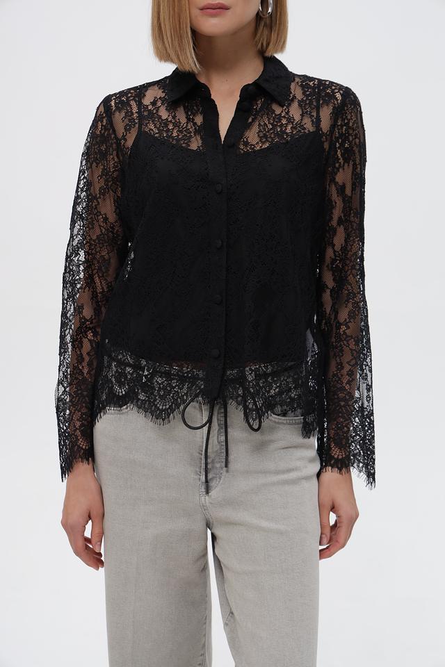 Изысканная блузка от Marc Cain, выполненная из тонкого черного кружева. Классический крой с длинными рукавами и отложным воротником делает эту модель универсальной для создания как повседневных, так и вечерних образов.