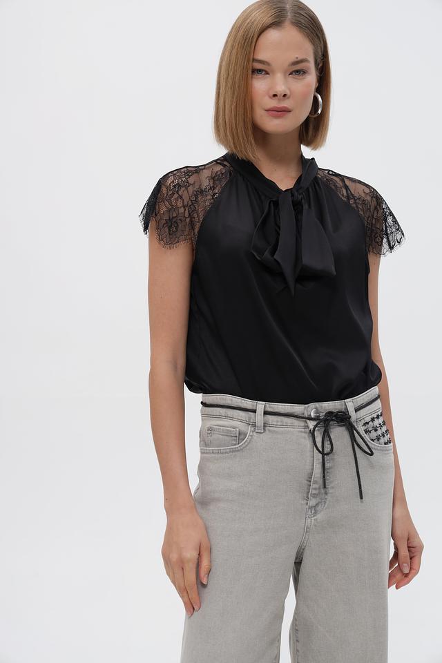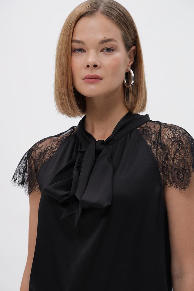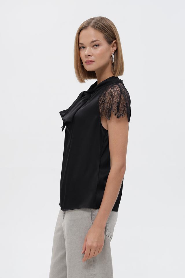 Особенностью блузки является её отделка: кружевные рукава придают образу романтичность и лёгкость, а декоративный бант на горловине добавляет элегантности.