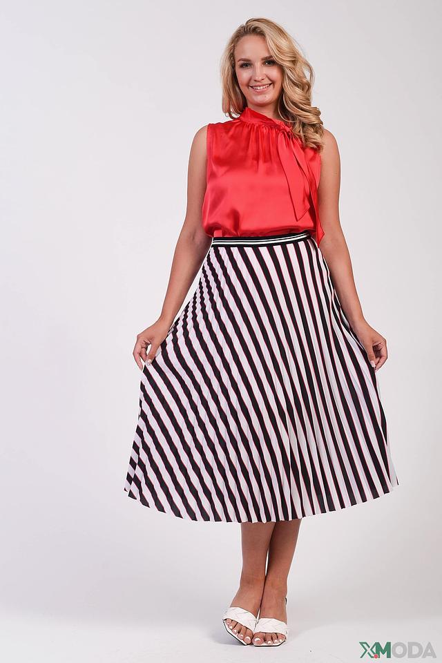 Юбка имеет плиссированную текстуру, которая придает ей элегантный и женственный вид. Пояс с эластичной резинкой обеспечивает комфортную посадку по фигуре. Материал – 100% полиэстер, что гарантирует легкость и практичность в уходе.