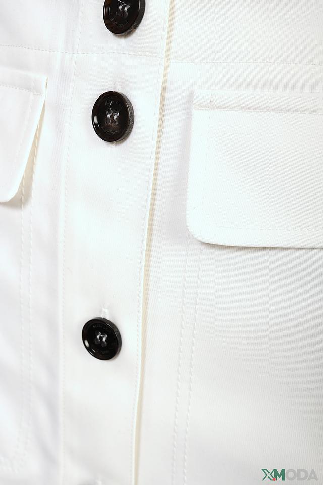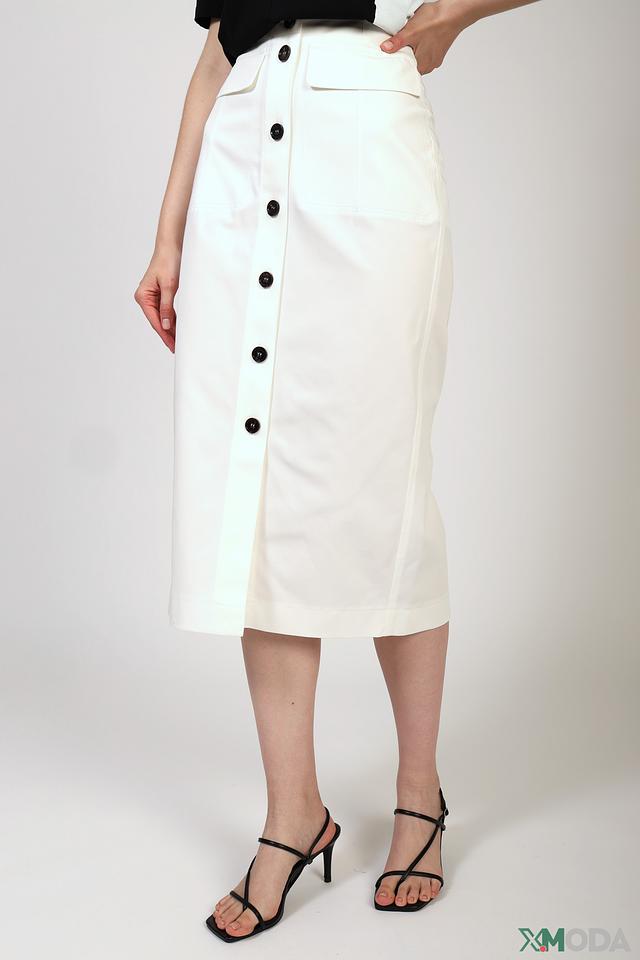 Юбка имеет прямую форму и застёжку на ряд пуговиц по всей длине. Пуговицы выполнены в тон ткани, что придаёт изделию сдержанность и элегантность. На передней части юбки расположены функциональные карманы.