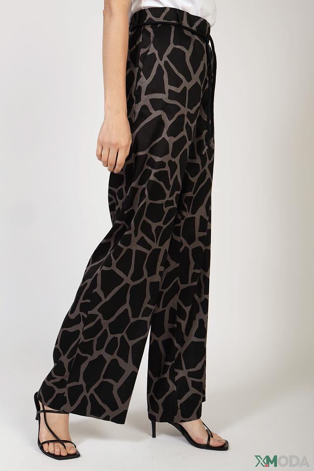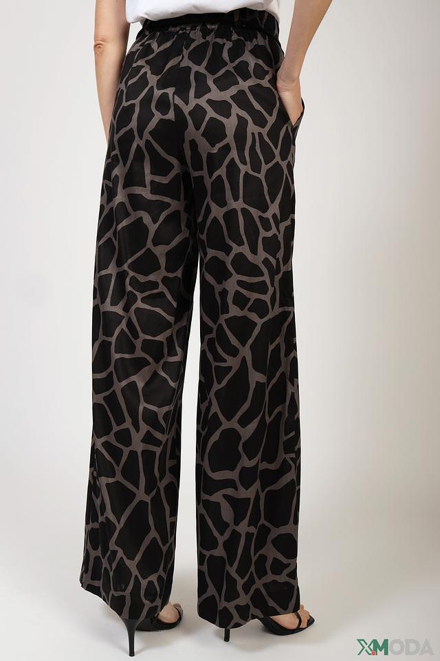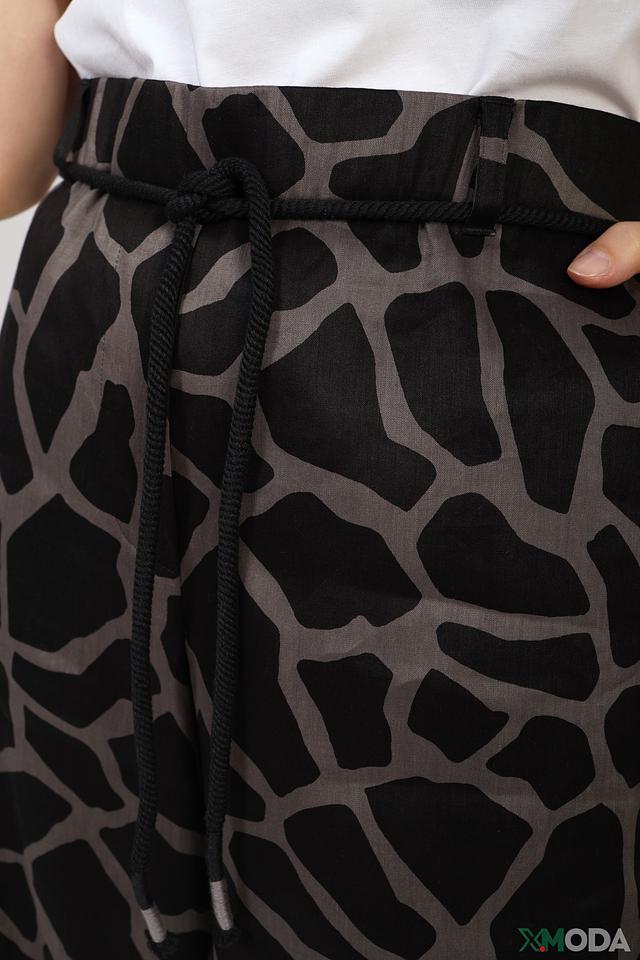 Женские брюки Marc Cain чёрно-серого цвета с оригинальным принтом под леопарда. Модель выполнена из лёгкой ткани с добавлением льна и вискозы, обеспечивающей комфорт и воздухопроницаемость. Брюки имеют удобный пояс на резинке со шнурком. Состав: лен 67%, вискоза 30%, эластан 3%