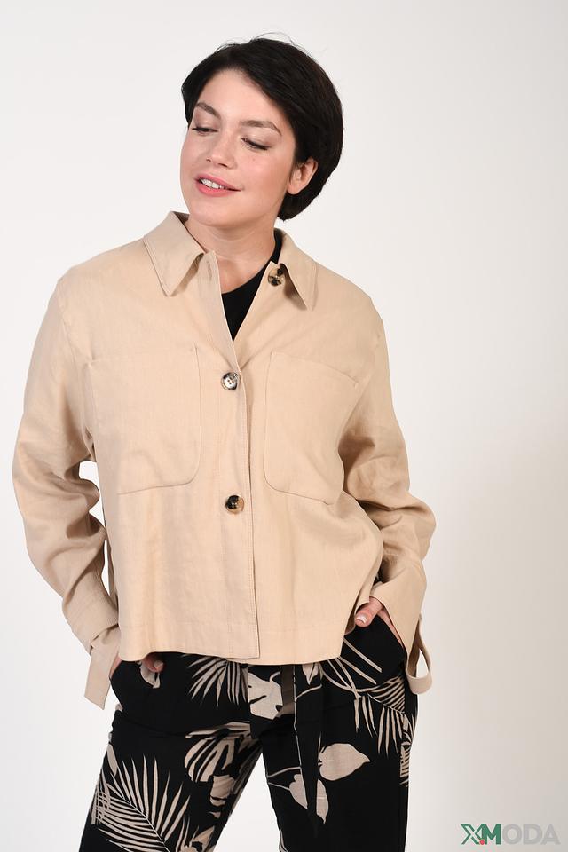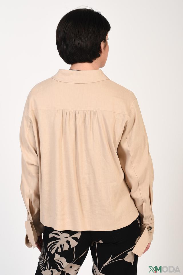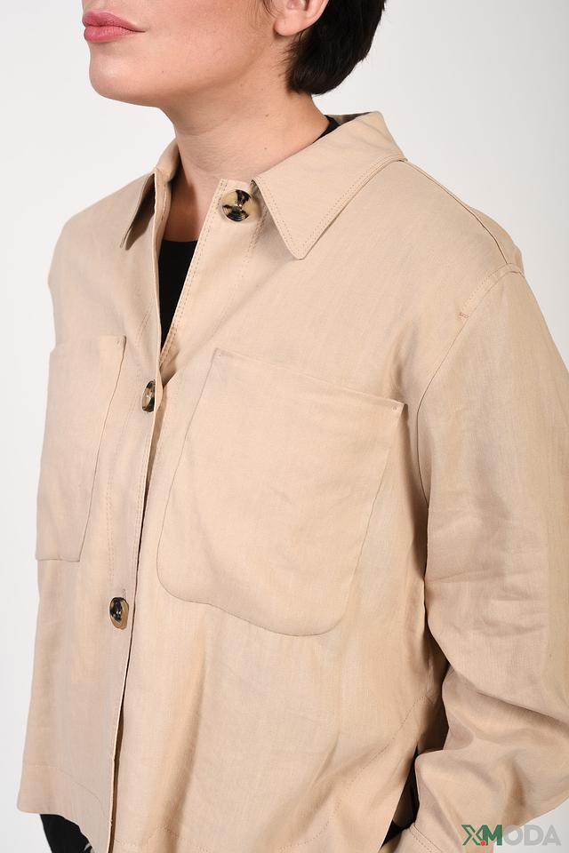 На передней части рубашки расположены накладные карманы, добавляющие ей функциональности и непринужденности. Цвет рубашки – бежевый, что делает ее универсальной и легко сочетаемой с различными элементами гардероба.