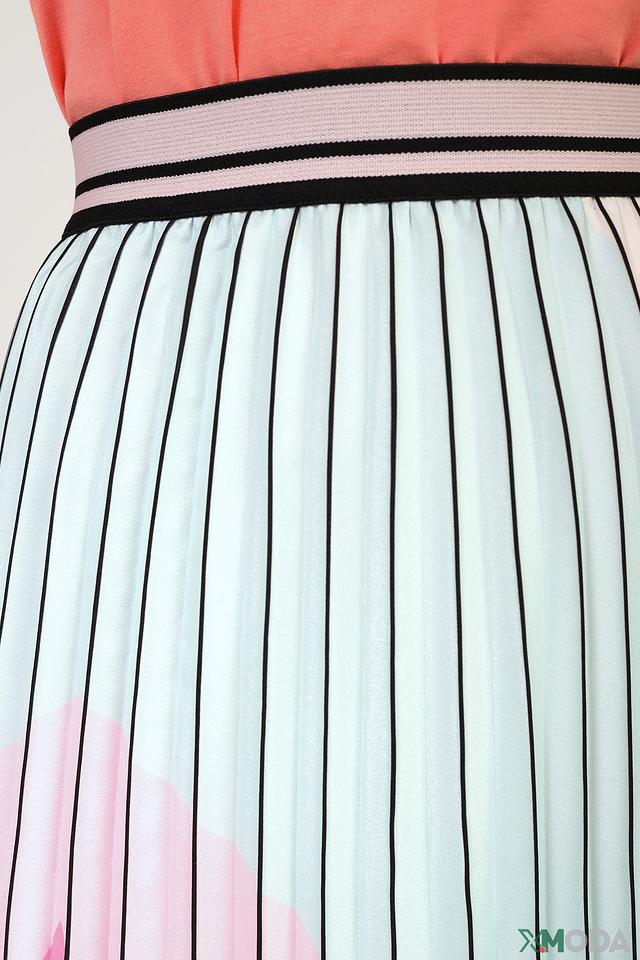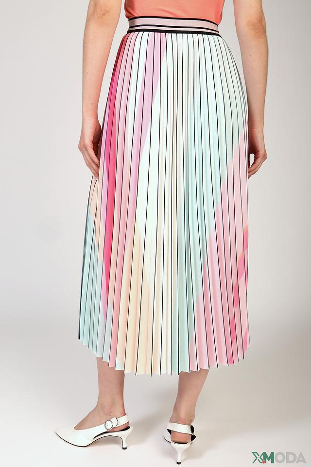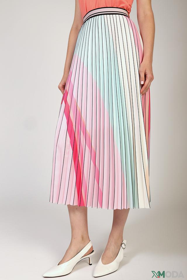 Юбка имеет плиссированную структуру и яркий, многоцветный принт, сочетающий в себе оттенки розового, голубого, персикового и белого. Широкий пояс с контрастной полоской добавляет акцент и подчеркивает талию.