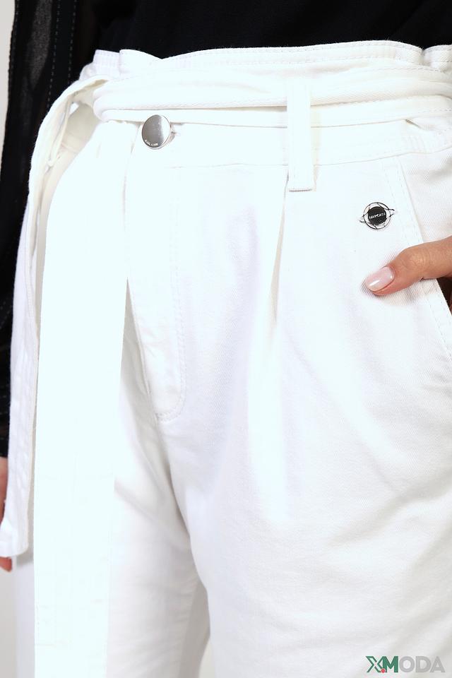 Джинсы имеют прямой крой и высокую посадку, что визуально удлиняет ноги и подчеркивает достоинства фигуры. Особенностью модели является широкий пояс с завязками, который акцентирует талию и создает женственный силуэт. Джинсы изготовлены из высококачественного хлопка с добавлением эластана, что обеспечивает комфорт при носке и сохранение формы.