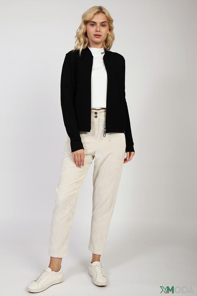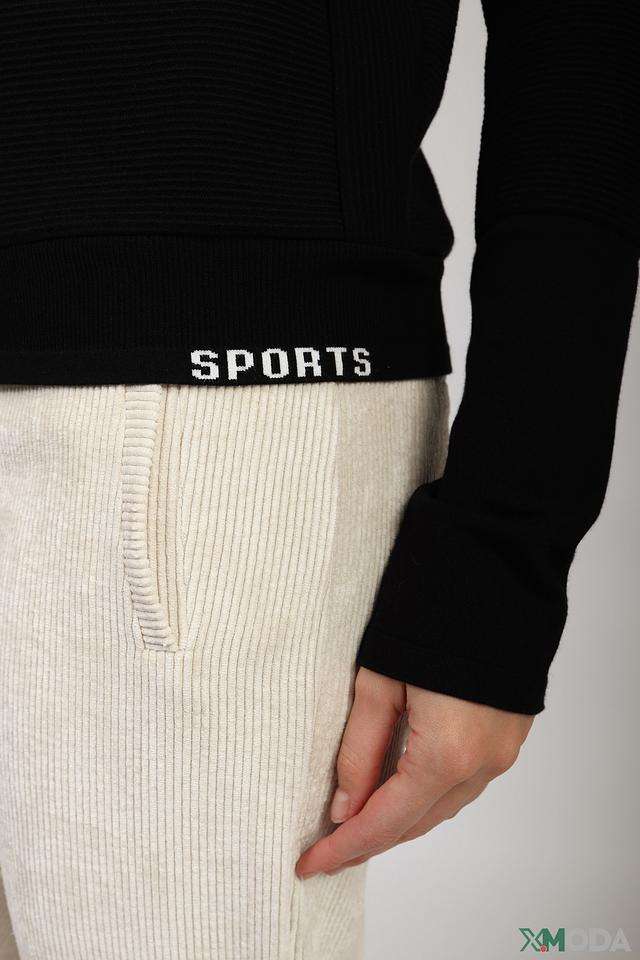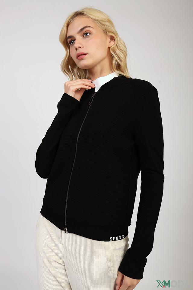 Жакет имеет приталенный силуэт и застегивается на молнию. Фактурный трикотаж придает изделию особый шарм, а декоративная полоса с надписью "SPORTS" на манжете добавляет спортивный акцент.
