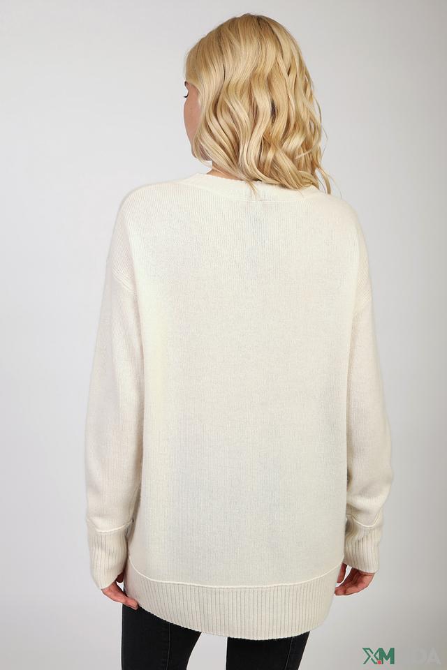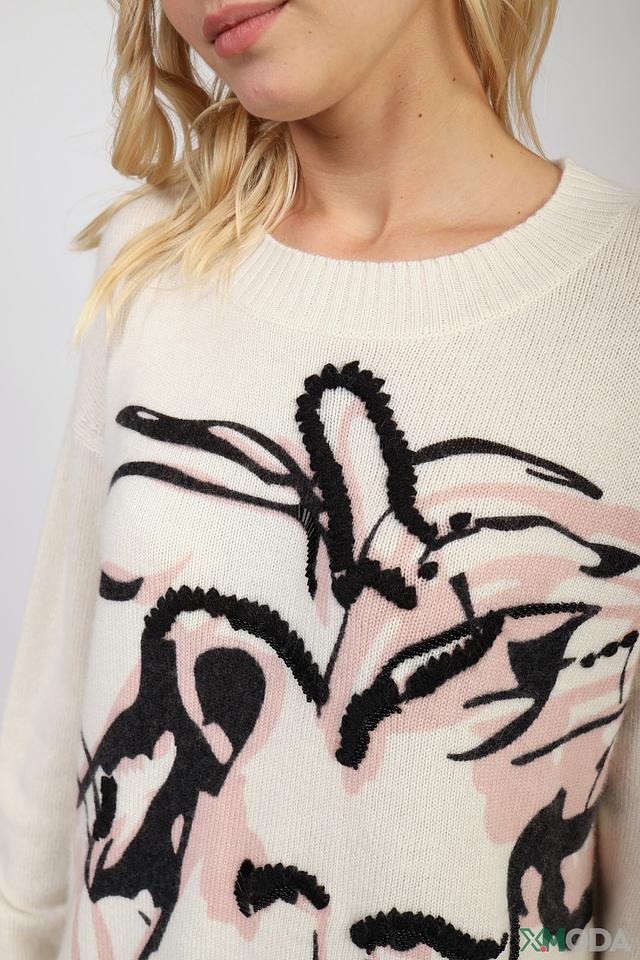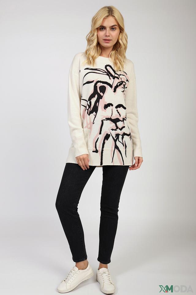 Пуловер имеет свободный крой, который не сковывает движений и позволяет создать расслабленный, но элегантный силуэт. Основной цвет изделия – бежевый, который служит идеальным фоном для выразительного принта.