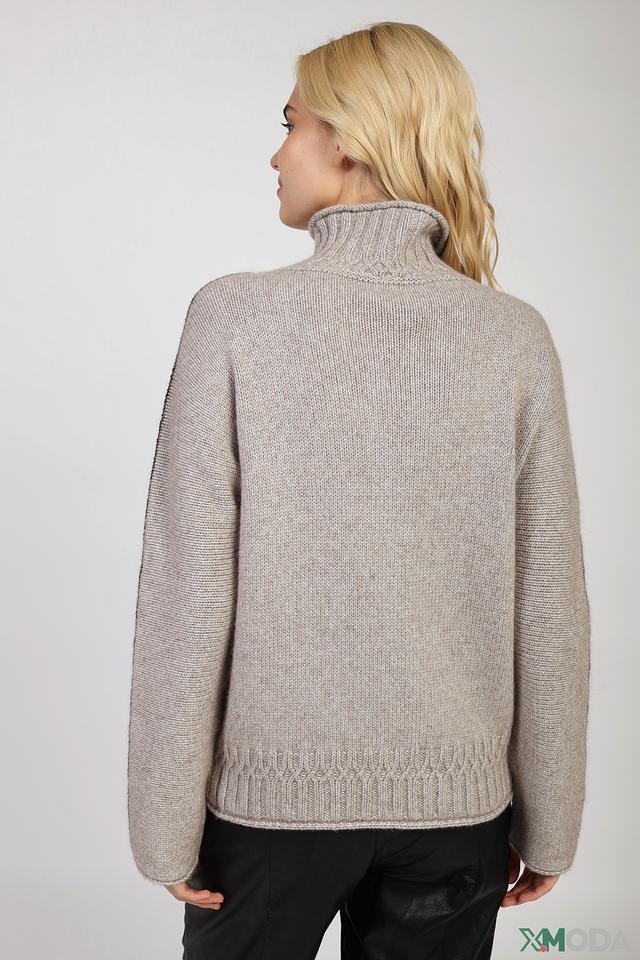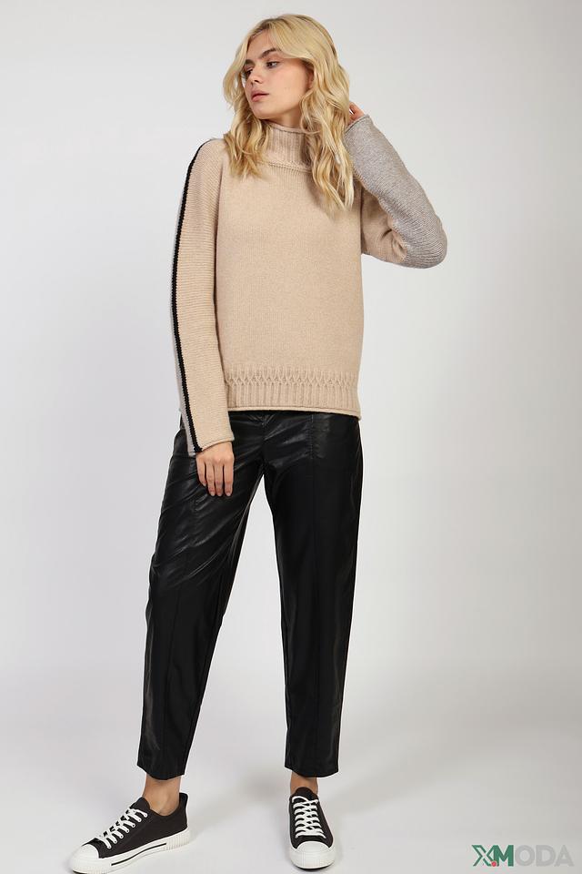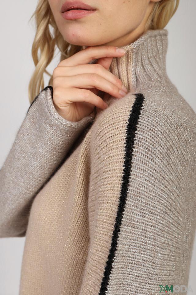 Водолазка имеет классический крой и нейтральный бежевый цвет, который легко сочетается с различными элементами одежды. Оригинальную деталь добавляет контрастная чёрная полоска на рукаве, придающая образу динамичность и современность.