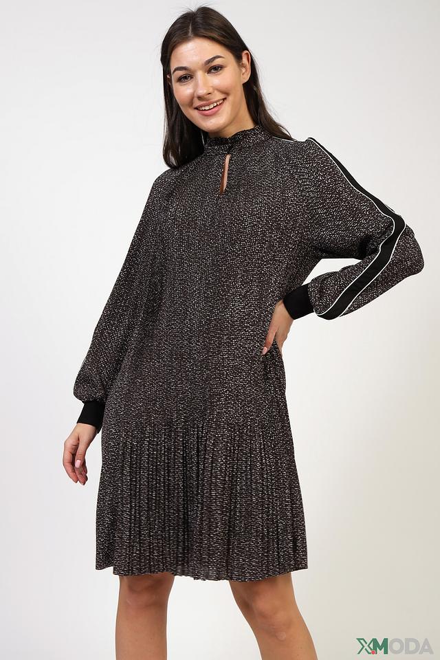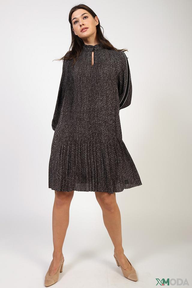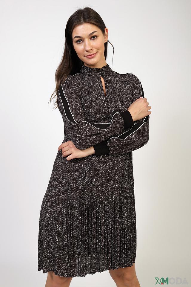 Платье Marc Cain чёрного цвета с мелким принтом и плиссированной юбкой. Модель имеет рукава 3/4 с контрастной белой полосой и небольшой вырез горловины. Состав: полиэстер 100%, Состав_отделка вискоза 88%, Состав_подкладка полиэстер 85%, Состав_подкладка эластан 15%, Состав_отделка эластан 12%