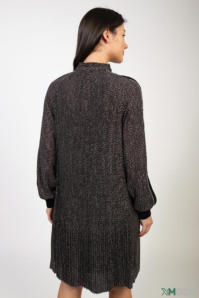 Модель имеет прямой силуэт, рукава три четверти с манжетами, украшенными контрастной белой полосой. Вырез горловины оформлен небольшим разрезом и воротником-стойкой. Плиссированная юбка придает платью лёгкость и динамичность.