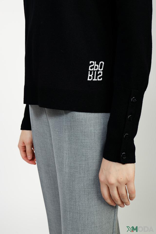 Чёрный пуловер Marc Cain из смесовой шерсти с декоративными пуговицами на рукавах. Модель имеет слегка заниженную линию плеч и вышитый логотип на рукаве, что придает ей особый стиль. Состав: шерсть 47%, вискоза 38%, полиамид 10%, кашемир 5%