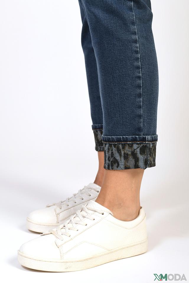 Джинсы имеют прямой крой и стандартную посадку, обеспечивая комфорт в носке. Особенностью модели являются манжеты в нижней части штанин, украшенные леопардовым принтом, что придает им оригинальный и современный вид.