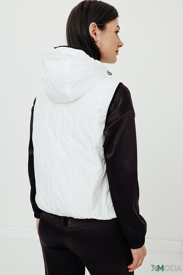 Модель имеет стеганую фактуру, капюшон и застёжку-молнию во всю длину. Рукава и часть переда выполнены из гладкой ткани, что добавляет динамики образу. Жилет отлично подойдет для прохладной погоды, обеспечивая тепло и свободу движений.