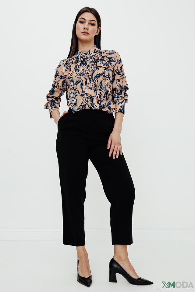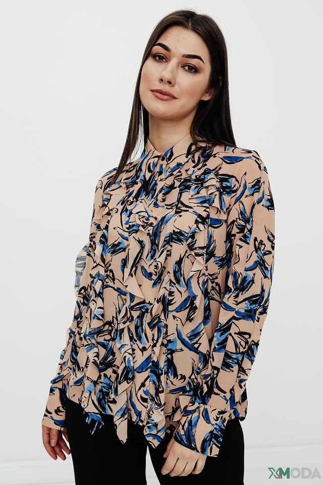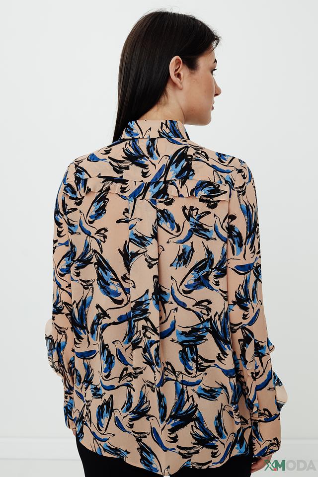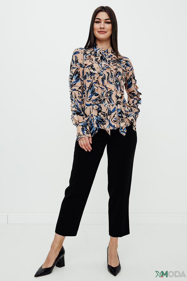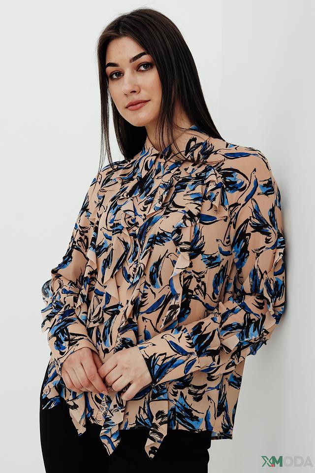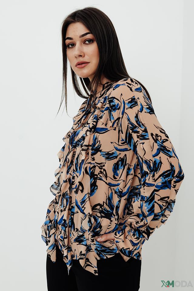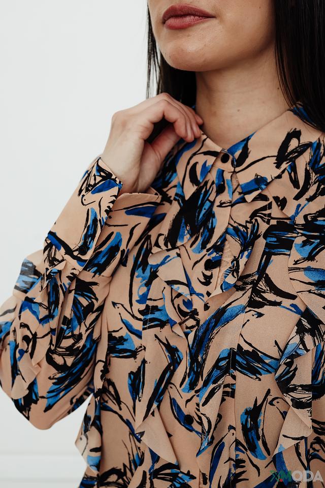 Основной цвет блузы – бежевый, который служит идеальным фоном для яркого и динамичного сине-голубого принта. Принт выполнен в виде абстрактных мазков, напоминающих листья или перья, что придает блузе оригинальность и неповторимость.