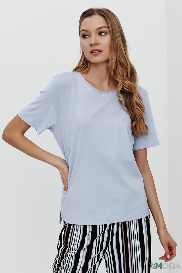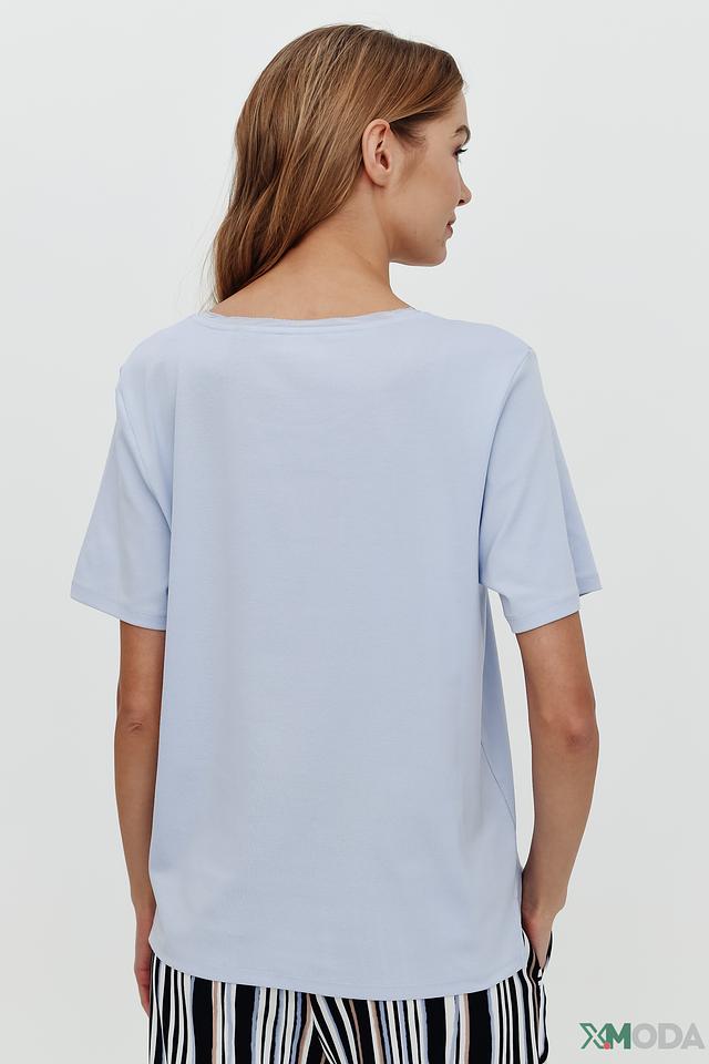 Нежный светло-голубой цвет придаёт образу свежесть и легкость. Футболка украшена небольшим логотипом бренда. Состав: 95% хлопок, 5% эластан.
